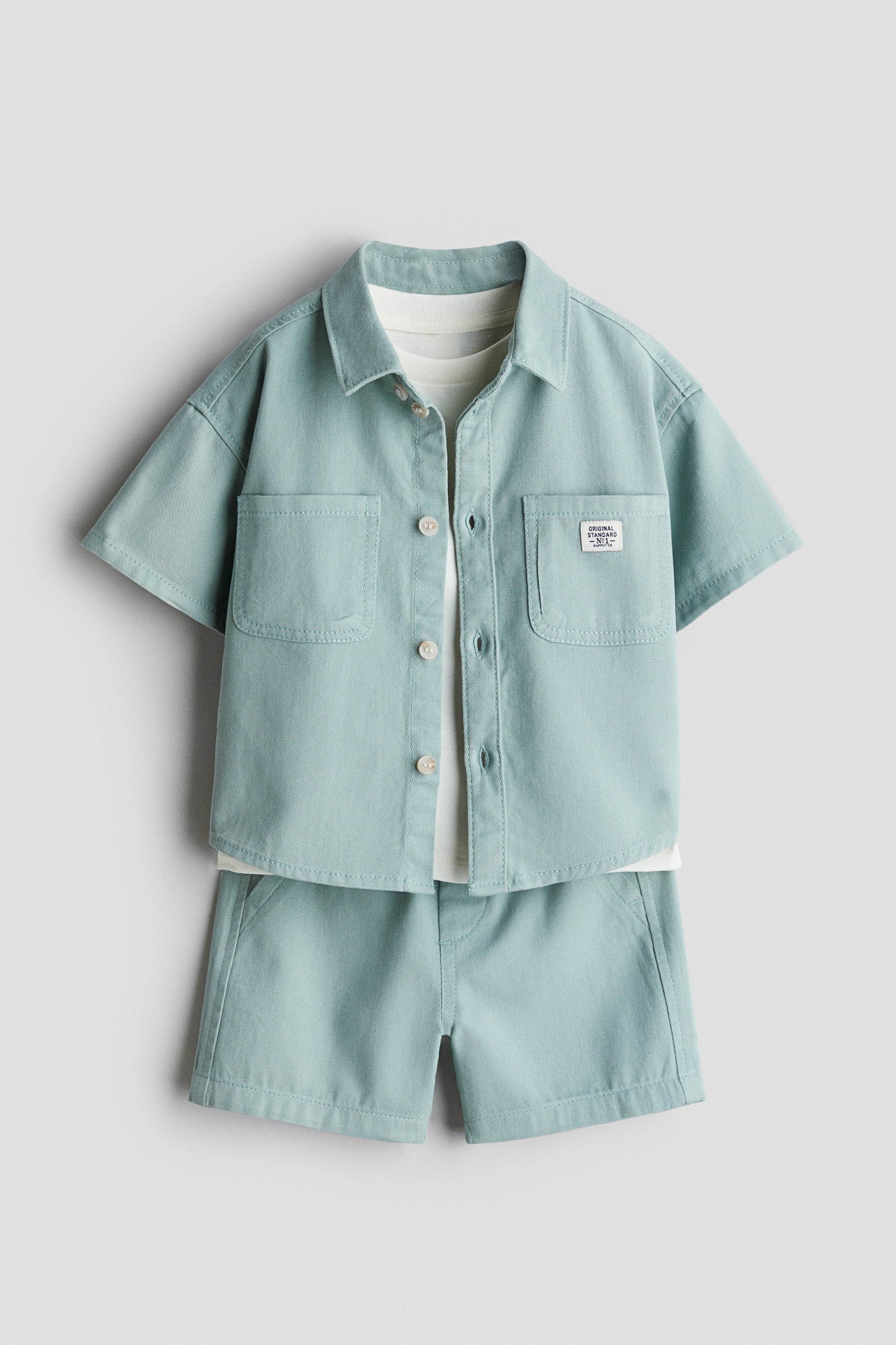 Ett set med en skjorta i bomullstwill, en T-shirt i mjuk bomullstrikå och ett par shorts i bomullstwill. Skjortan har krage, knappar i träimitation fram, nedhasad axel, kort ärm och öppen bröstficka. T-shirten har rund halsringning med ribbad mudd och tryckknappar på ena axeln (ej storlek 98–104). Byxorna har resår och dragsko i midjan för enkel påklädning, fuskgylf och fuskfickor.