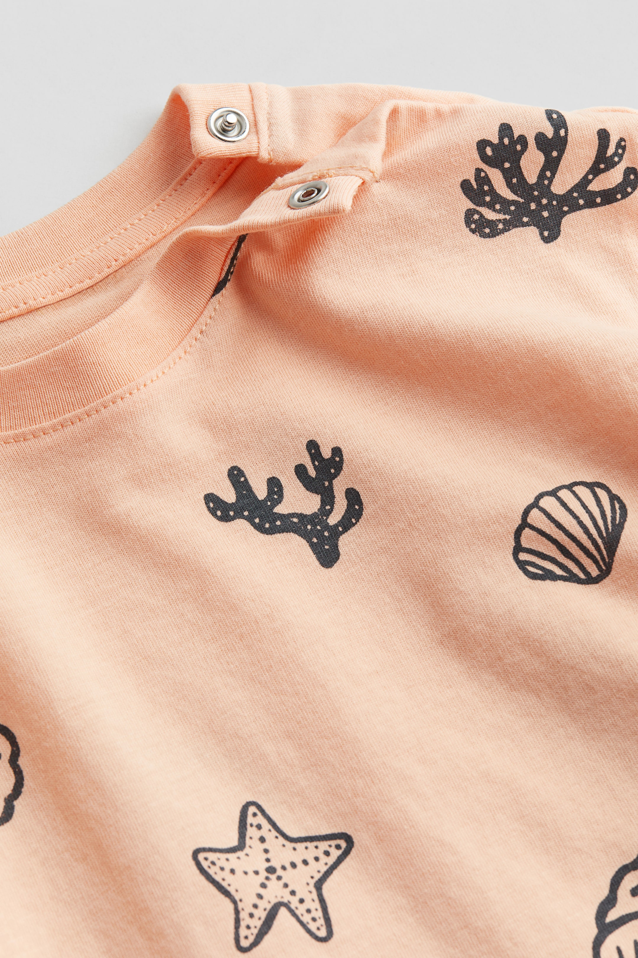 En T-shirt i mjuk bomullstrikå med tryckt mönster. T-shirten har ribbad mudd kring halsringningen och tryckknapp på ena axeln (ej storlek 98–104).