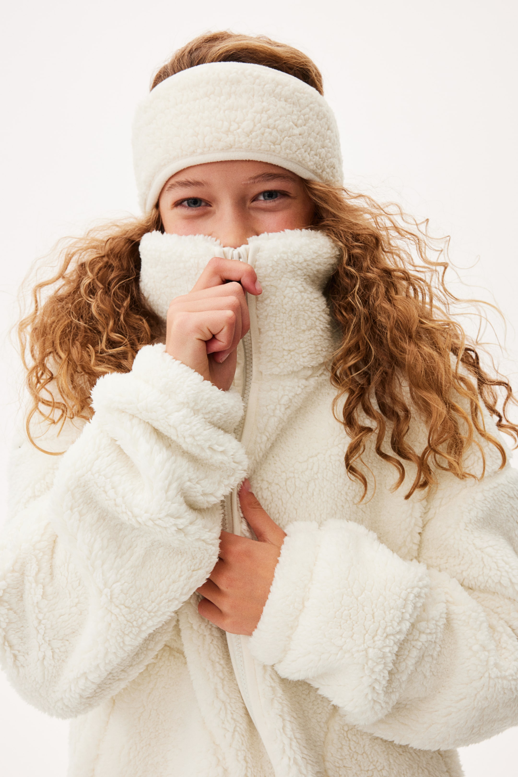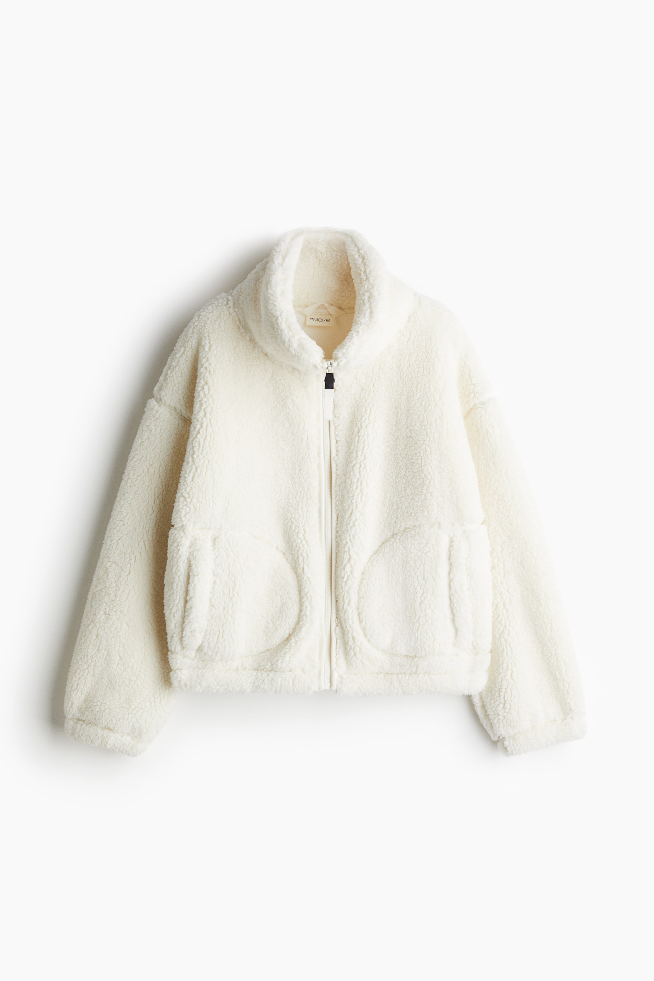 En oversized träningsjacka i mjuk, värmande pile. Jackan har ståkrage, dragkedja med hakskydd som minskar risken för skav och handvärmarfickor i sidorna. Nedhasad axel och lång ärm med klädd resår vid ärmslut.