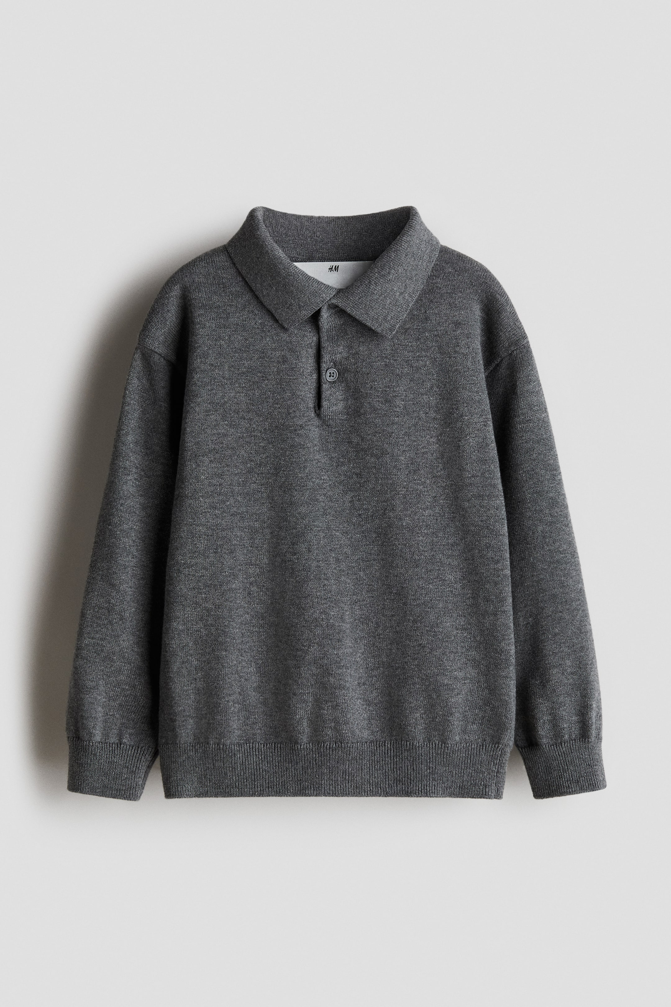 En långärmad pikétröja i finstickad bomull. Tröjan har ribbad krage, knappslå och nedhasad axel. Ribbstickad mudd vid ärmslut och nedtill.