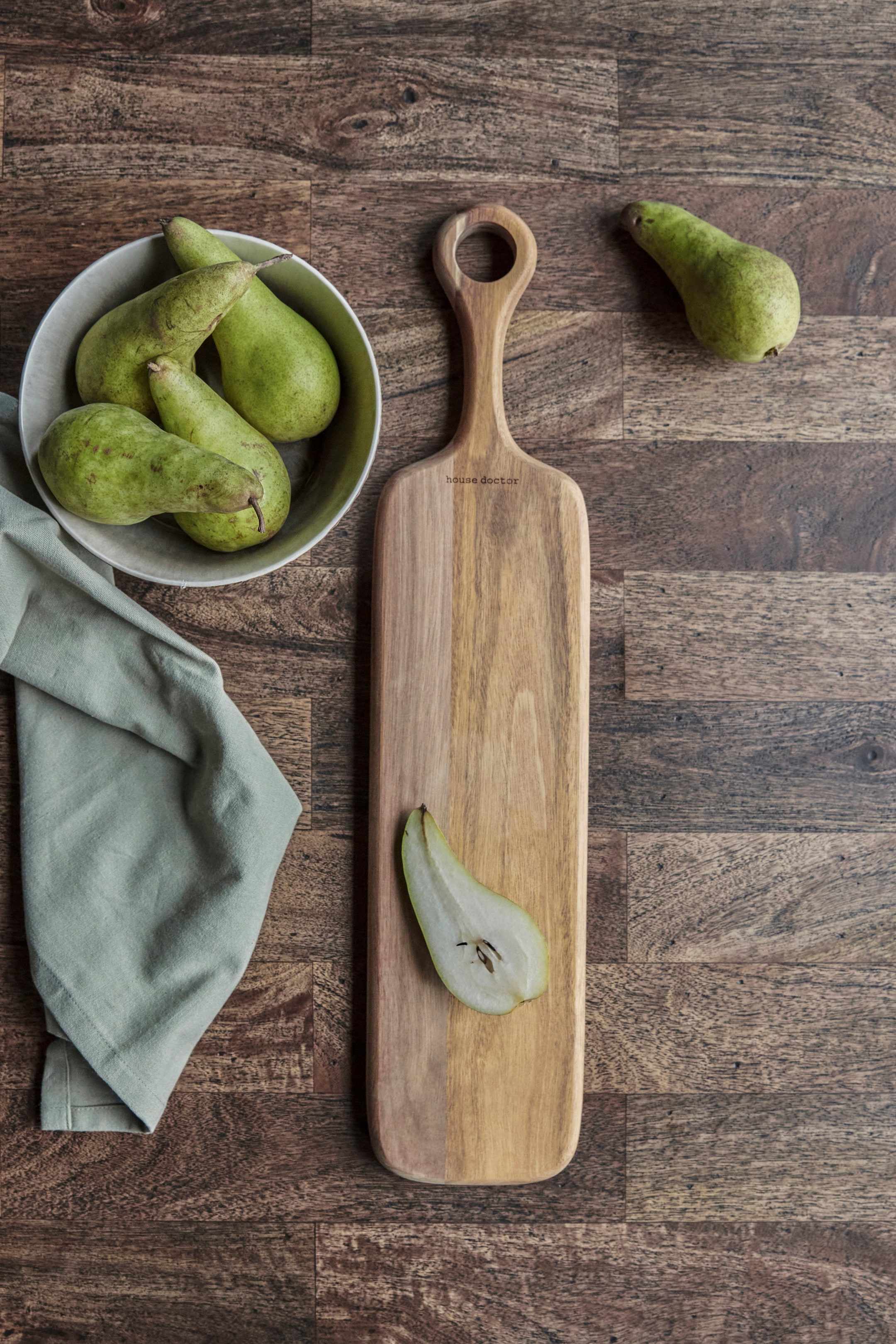 Den här långa skärbrädan från House Doctor är ett måste i vardagen. Gjord i akaciaträ ger den köksinredningen en varm och inviterande touch. Längden och handtaget gör den också idealisk som serveringsfat för tapas eller snacks när du får gäster på besök. Eller så kan du använda den när du skär upp bröd och baguetter. När den inte används kan du luta skärbrädan mot väggen som en del av köksinredningen. l: 55 cm, w: 12 cm, h: 2 cm
