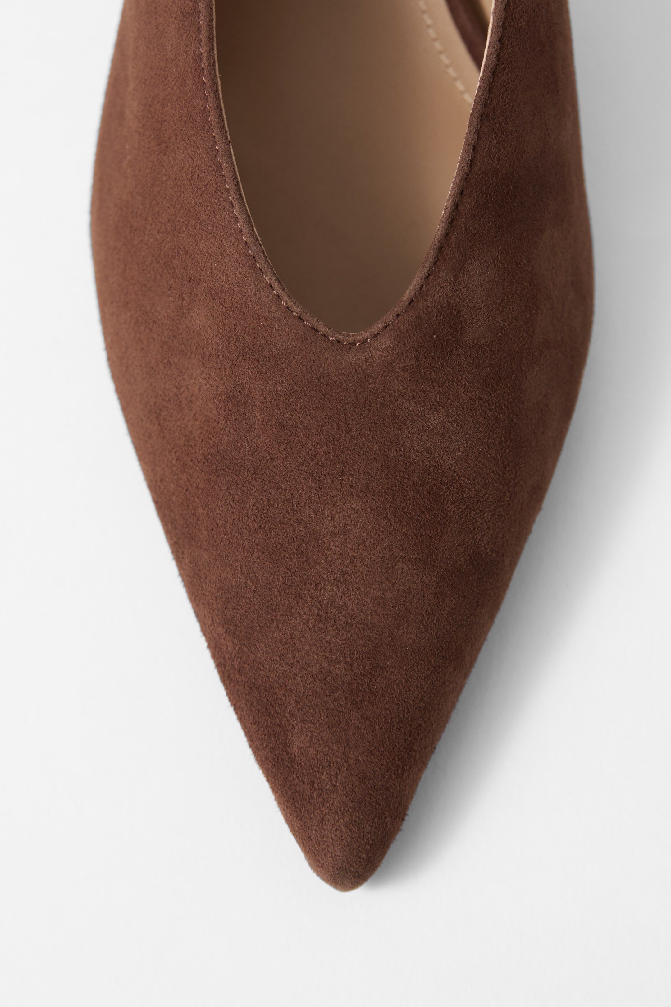 Slingbacks med låg klack och spetsig tå. I blankt läder och med ett något högre skuret ovanläder. Smala remmar med silverspännen. Klackhöjd: 4,5 cm