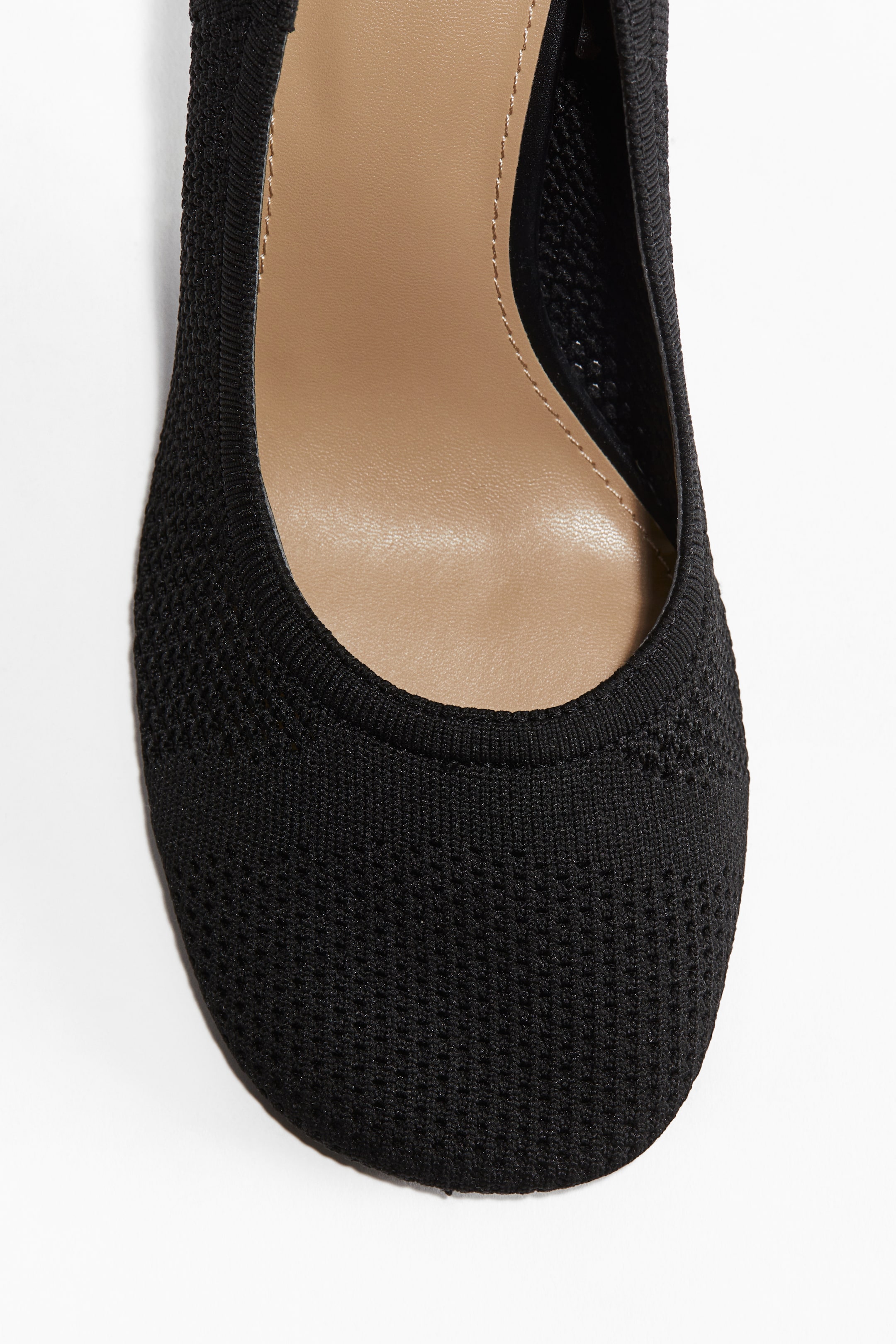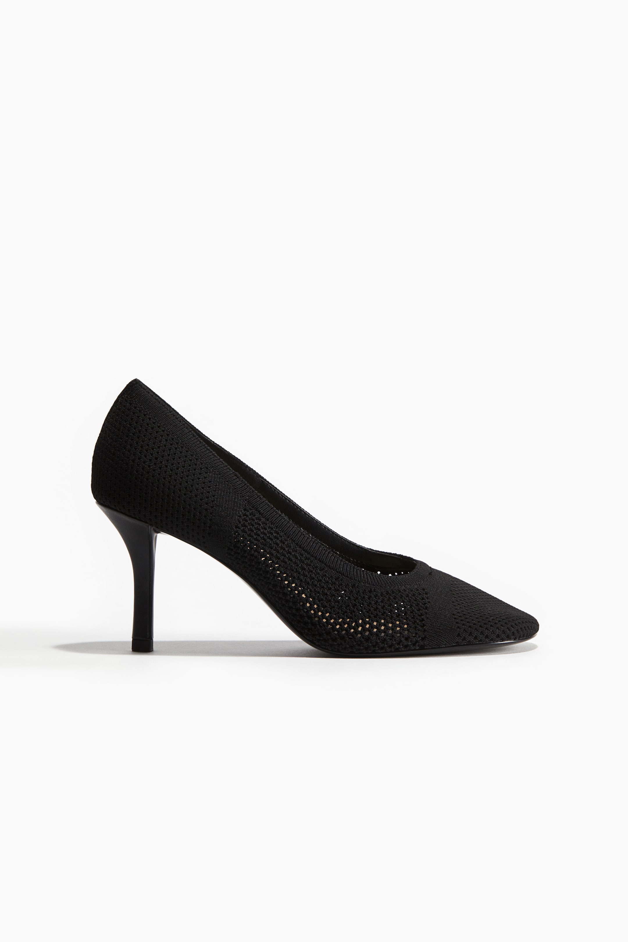 Ett par formstickade pumps i mesh med rundad tå och hög klack.