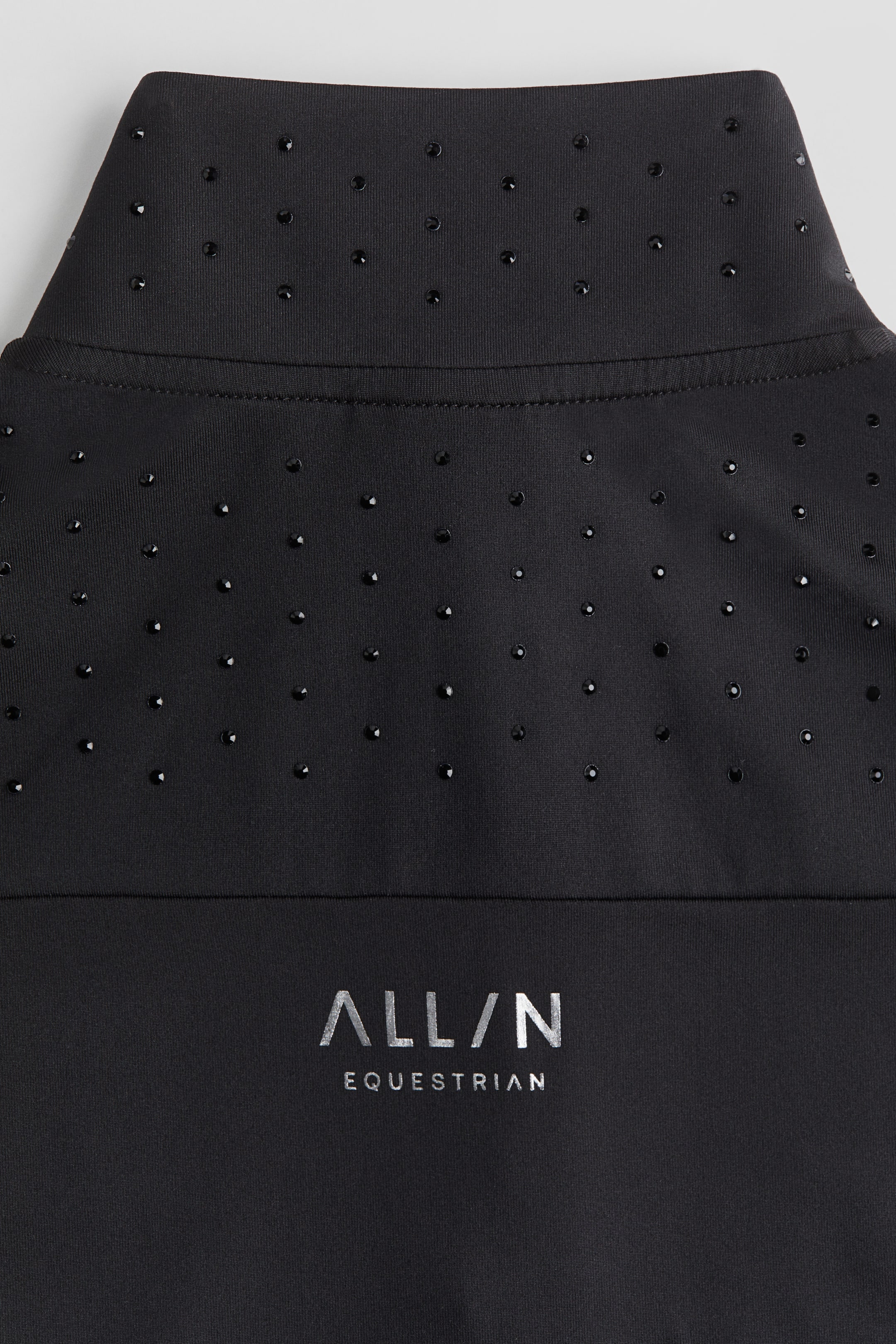 En långärmad träningströja i snabbtorkade trikå som andas. Tröjan är delvis prydd med små, strasslipade stenar fram och bak. Ståkrage och dragkedja upptill med hakskydd som minskar risken för skav.