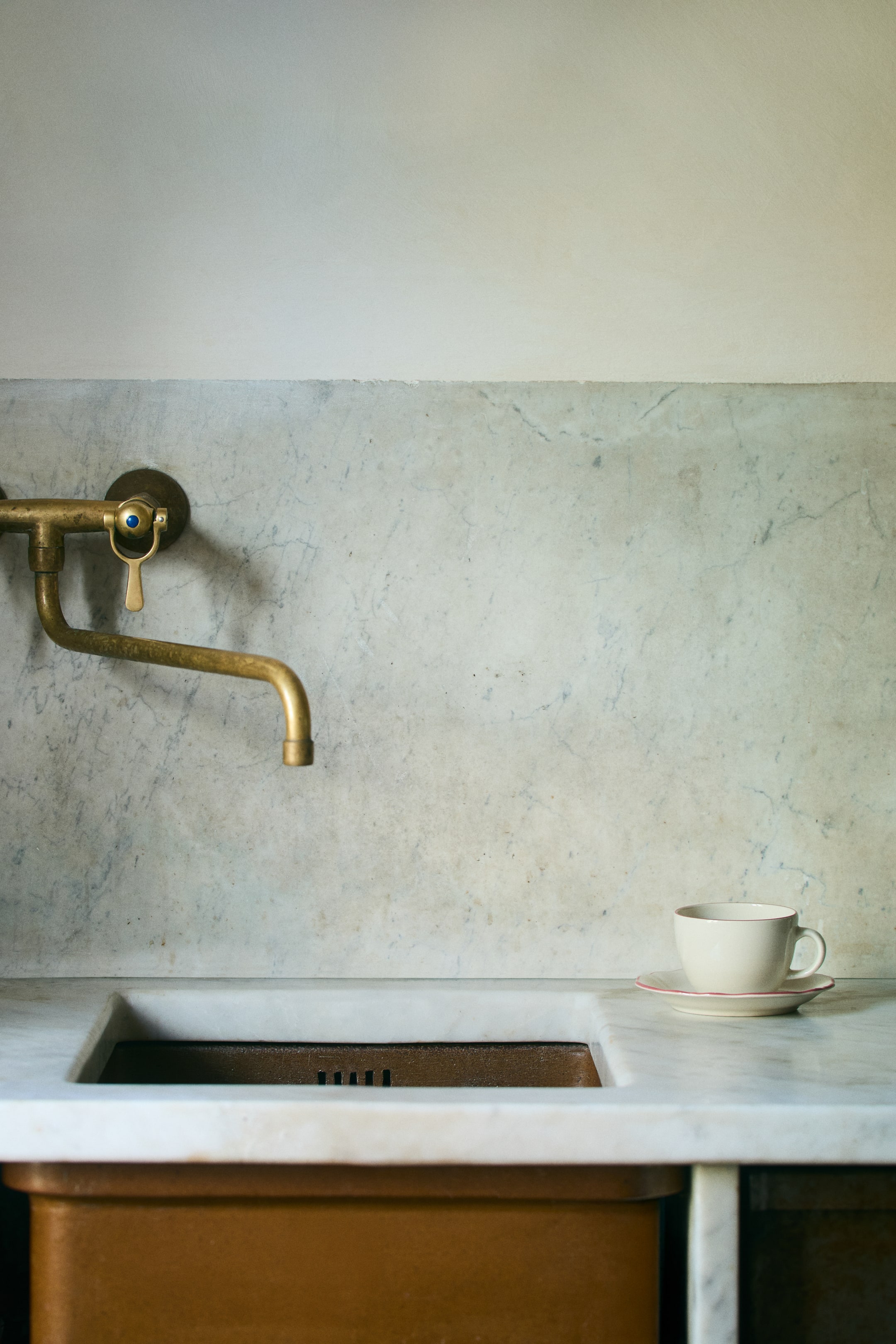 Två koppar med tillhörande fat i stengods med vintageinspirerad design och handmålad kant.