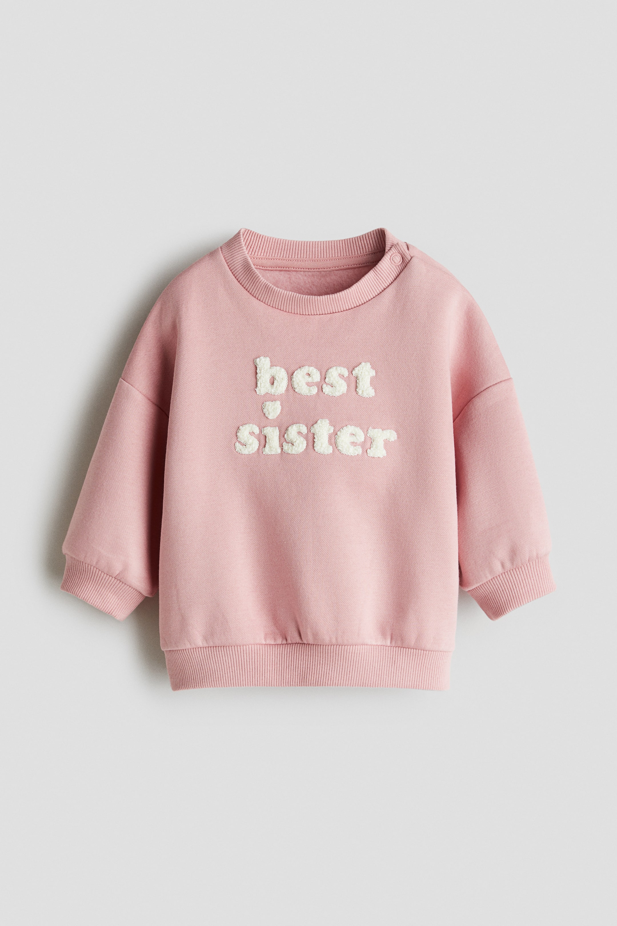 En tröja i sweatshirtkvalitet med mjuk, borstad insida och frottéapplikationer. Tröjan har rund, ribbad halsringning, nedhasad axel och tryckknappar i ena sidan (ej storlek 98–104). Ribbad mudd vid ärmslut och i nederkant.