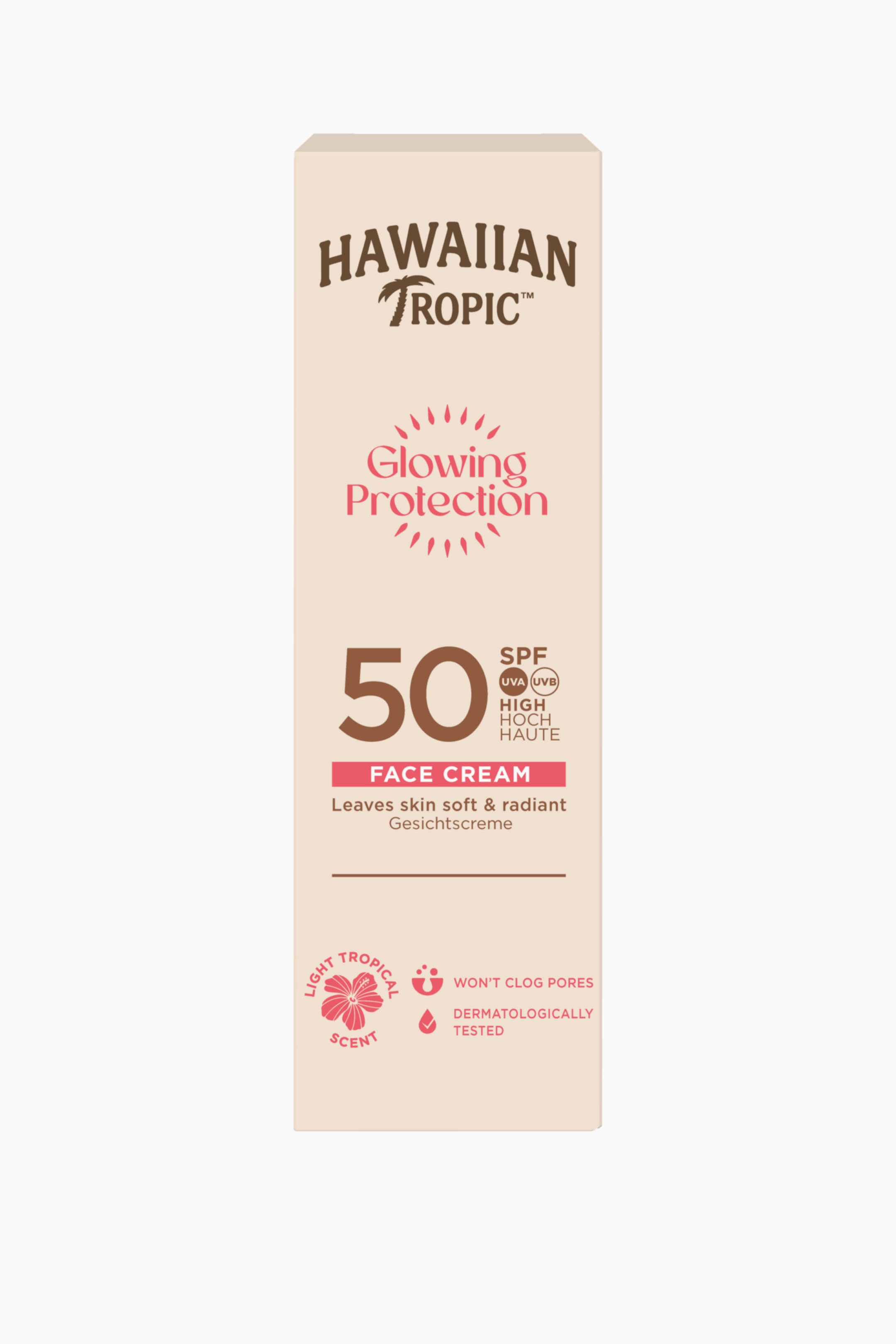 Upplev den perfekta kombinationen av solskydd och hudvård med Hawaiian Tropic Glowing Protection Face Cream SPF 50. Denna dermatologiskt testade ansiktskräm ger ett högt UVA/UVB-skydd samtidigt som den vårdar huden med sheasmör och vitamin E. Den lättabsorberade och oljefria formulan går snabbt in i huden och lämnar den mjuk och strålande utan att täppa till porerna. Perfekt för daglig användning – lätt formula, vattenresistent och ger effektivt skydd för både vardagen och soliga äventyr. SPF 50 med högt UVA/UVB-skydd. Dermatologiskt testad. Vattenresistent formula. Vårdande ingredienser som sheasmör och vitamin E. Oljefri. Vegansk. Lätt tropisk doft