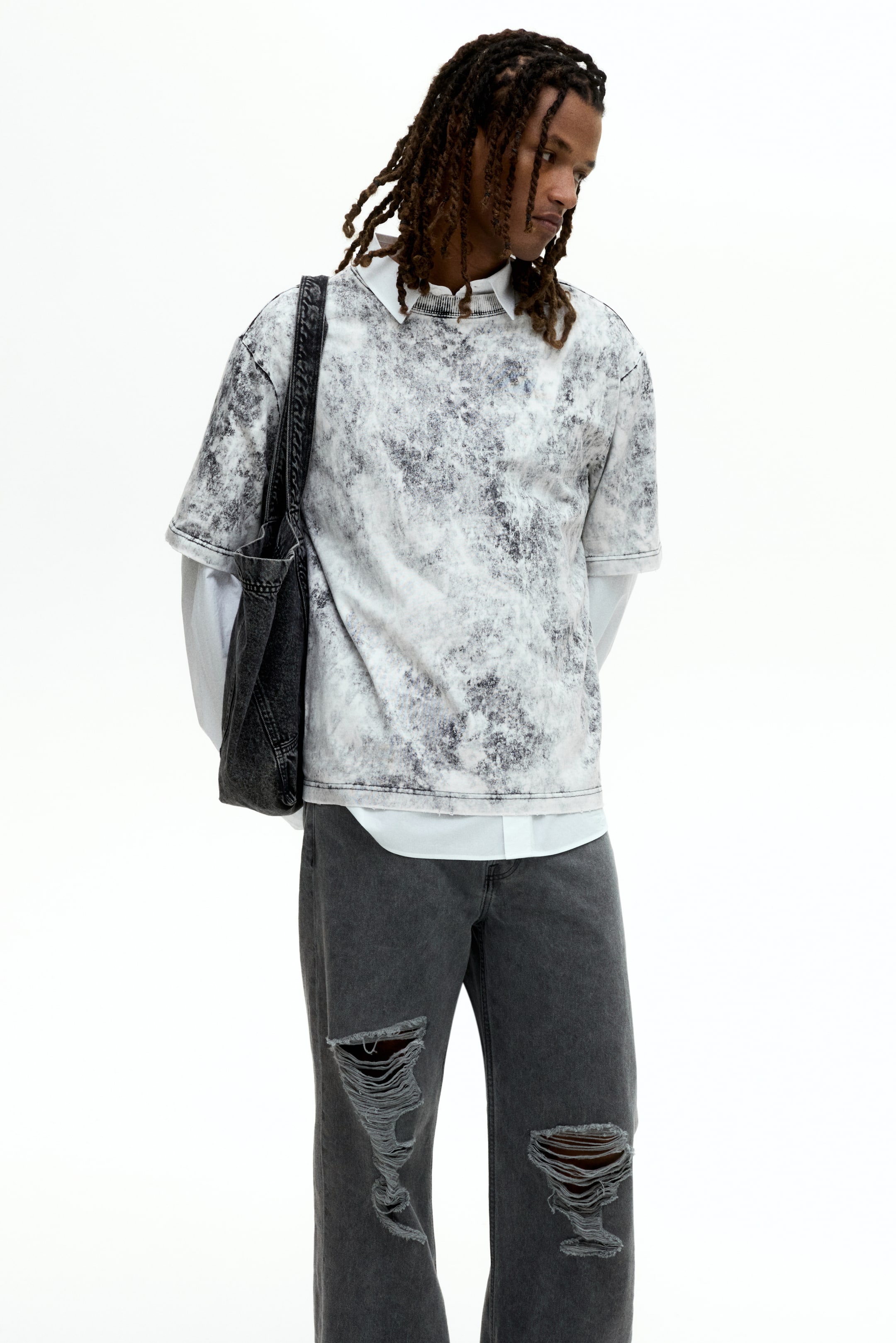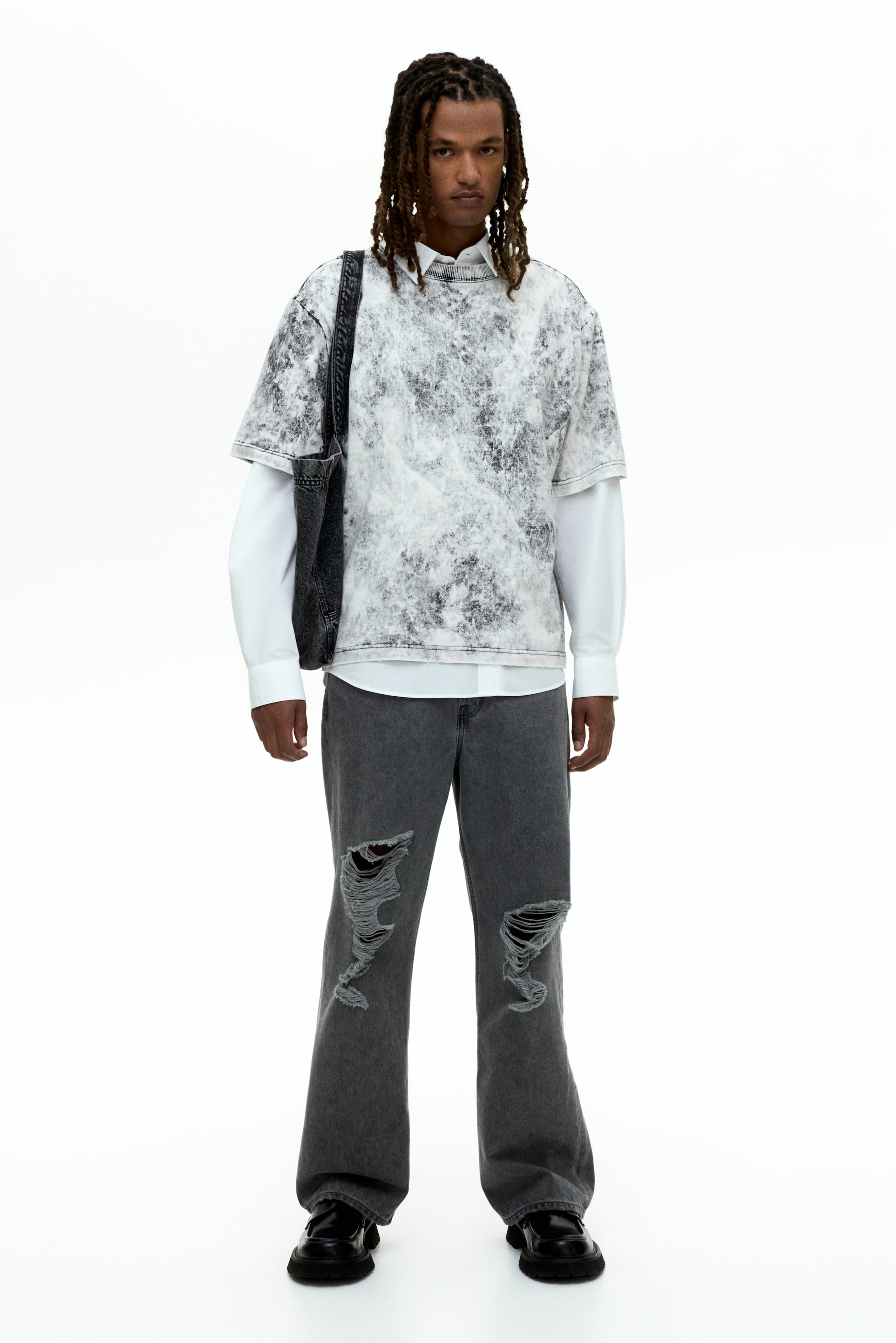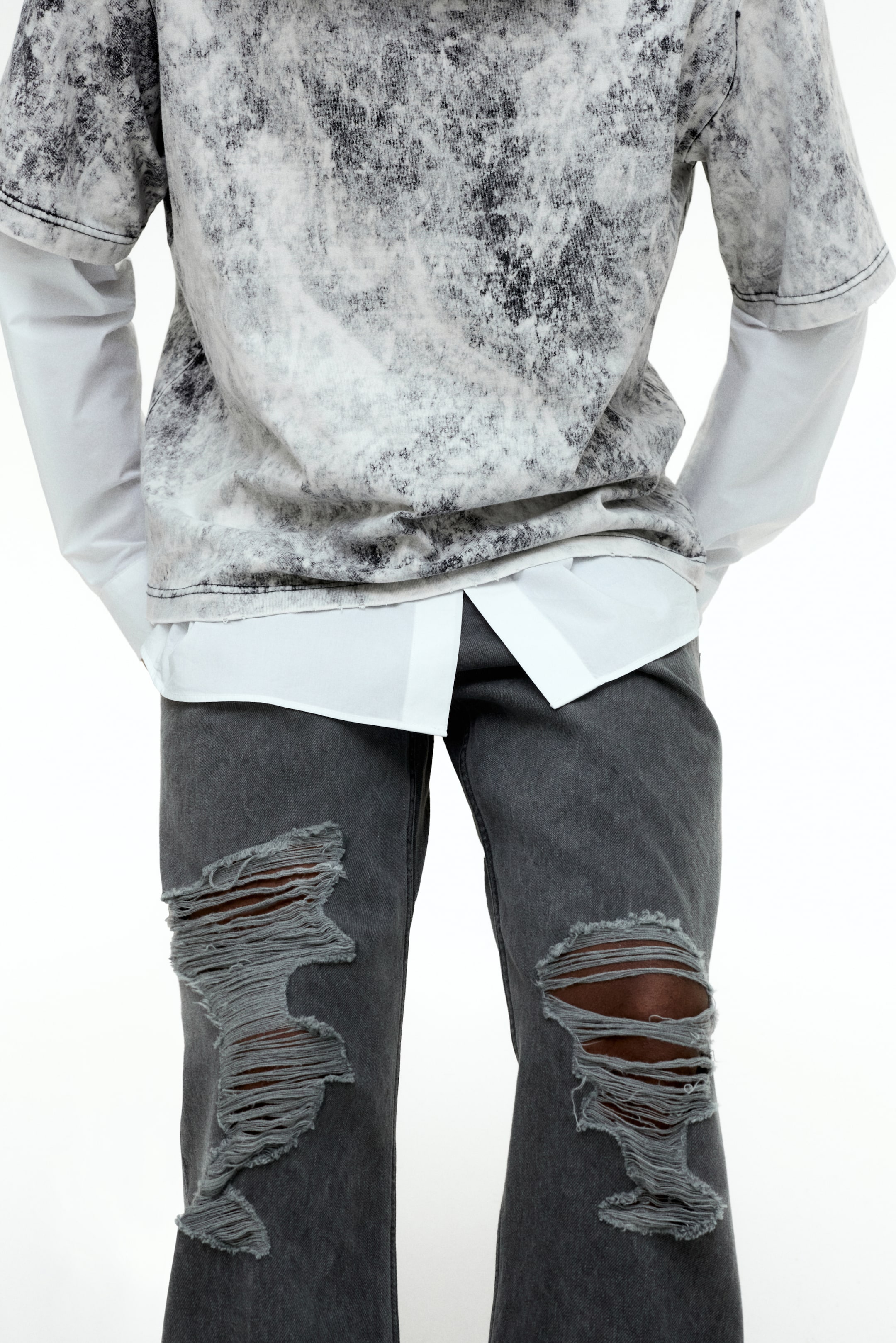 Ett par 5-ficksjeans i stadig bomullsdenim. Jeansen har raka ben och lös passform från stuss till benslut med låg gren och extra rörelsevidd. Normalhög midja, gylf med dragkedja och hårt slitna detaljer fram. Designade för att beundras.