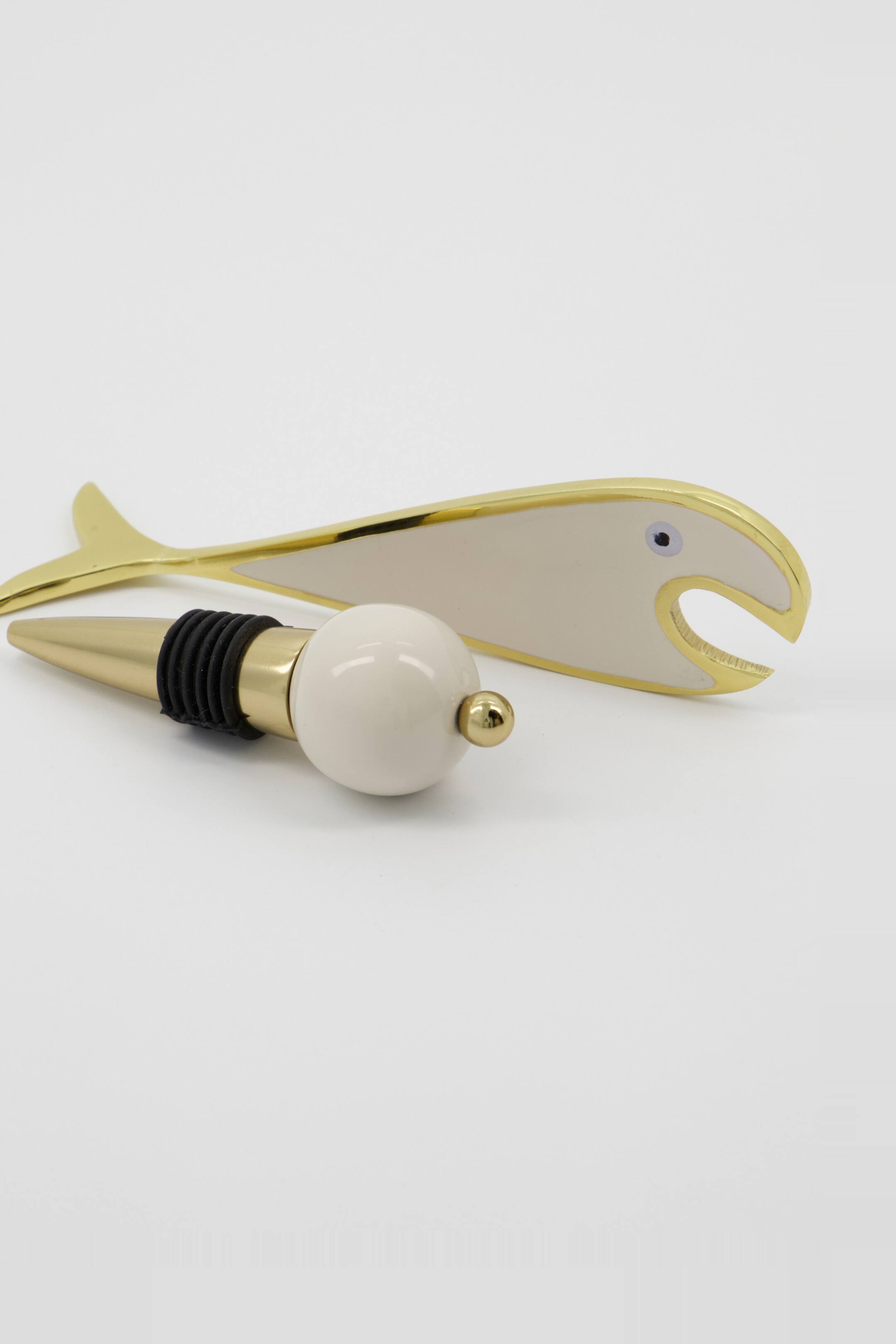 Inför en känsla av elegans och funktionalitet i din hemmabar med denna utsökta uppsättning bartillbehör. Med en fiskformad flasköppnare och en chic flaskpropp kombinerar setet en lyxig gyllene finish med subtila sandfärgade detaljer. Den smarta designen och högkvalitativa material säkerställer att dessa delar inte bara är praktiska utan också visuellt iögonfallande. Perfekt för underhållning eller som en omtänksam present, tillför detta set både stil och glädje vid varje sammankomst.- Fiskformad flasköppnare- Eleganta gyllene färger och sandfärger- Perfekt som present- Praktiskt och snyggt setGe en glad känsla i ditt underhållningsrum med dessa eleganta bartillbehör. L:, 15cm, W:, 4,5cm, H:10, 4cm