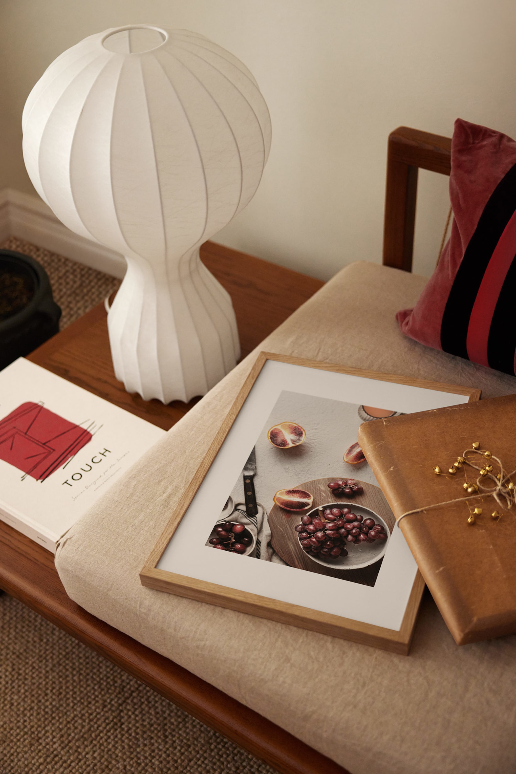 Ett fotografi med vindruvor och blodapelsiner, placerade på ett bord. Motivet är inramad med en inbyggd vit passepartout.