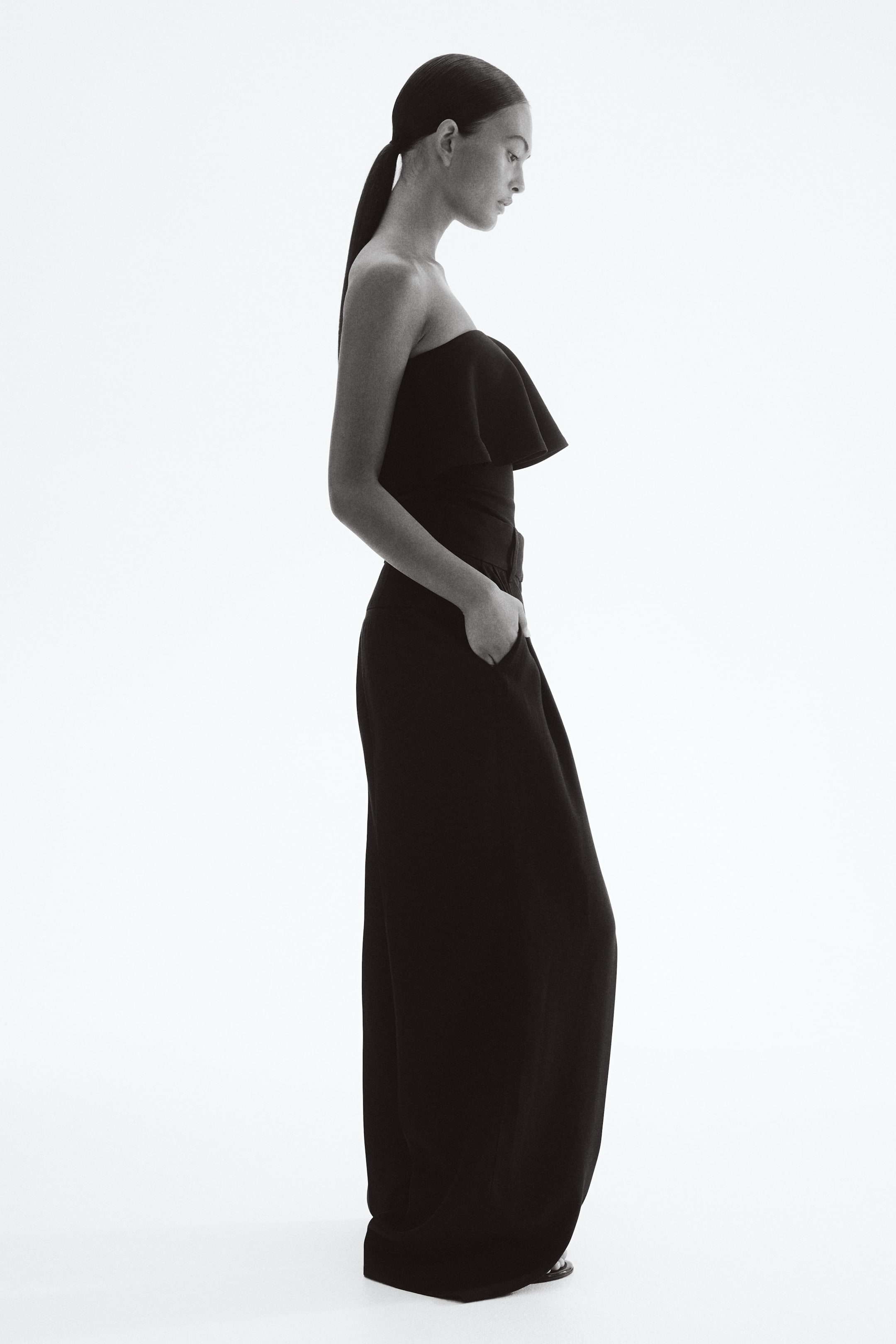Kalın interlok jarseden, üstte geniş farbalalı katlı, bedene oturan bandeau üst.