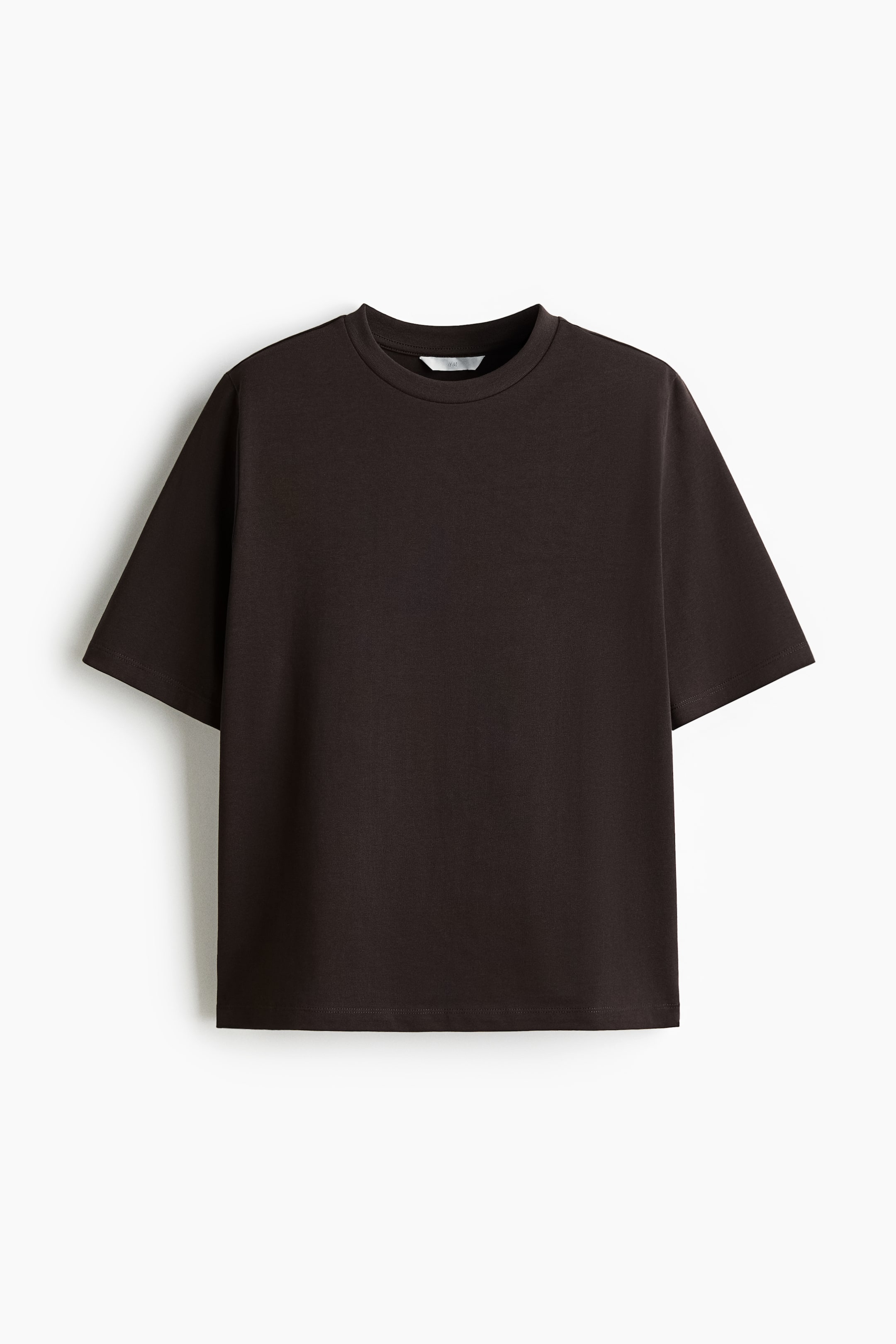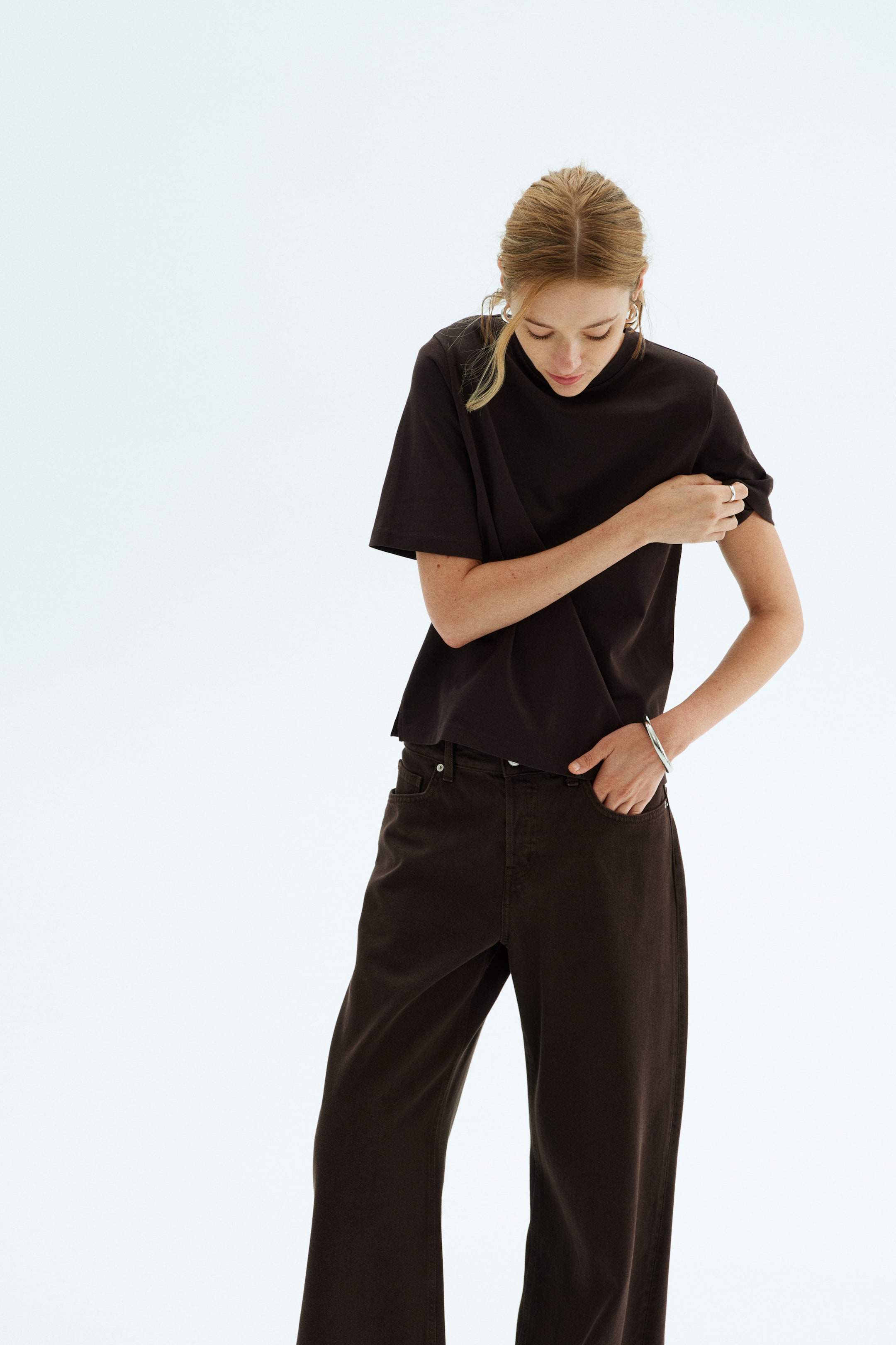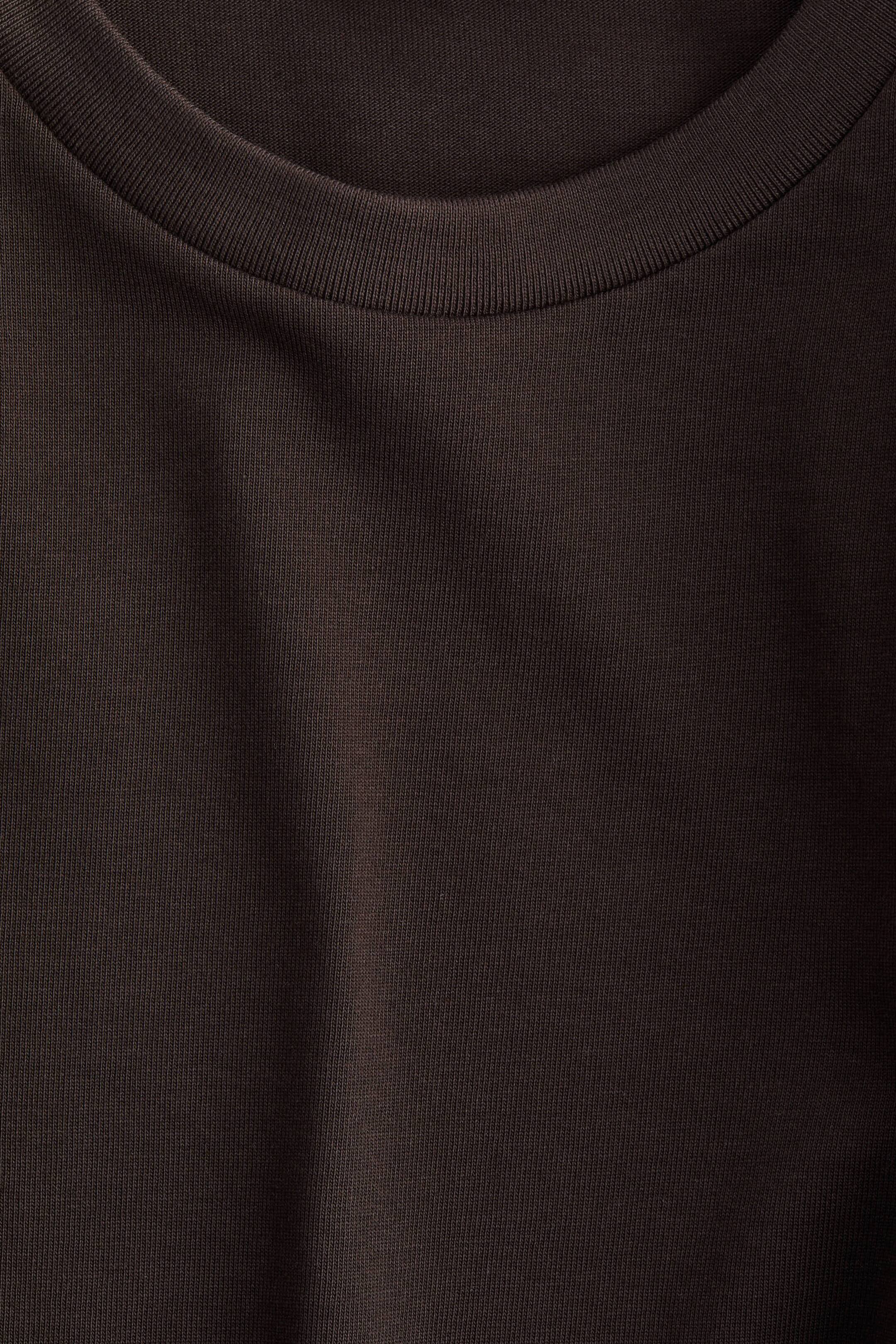 Pamuklu kalın jarseden, bisiklet yakalı, omuzları kalın vatkalı tişört. Etek ucu düz ve yanları yırtmaçlı.
