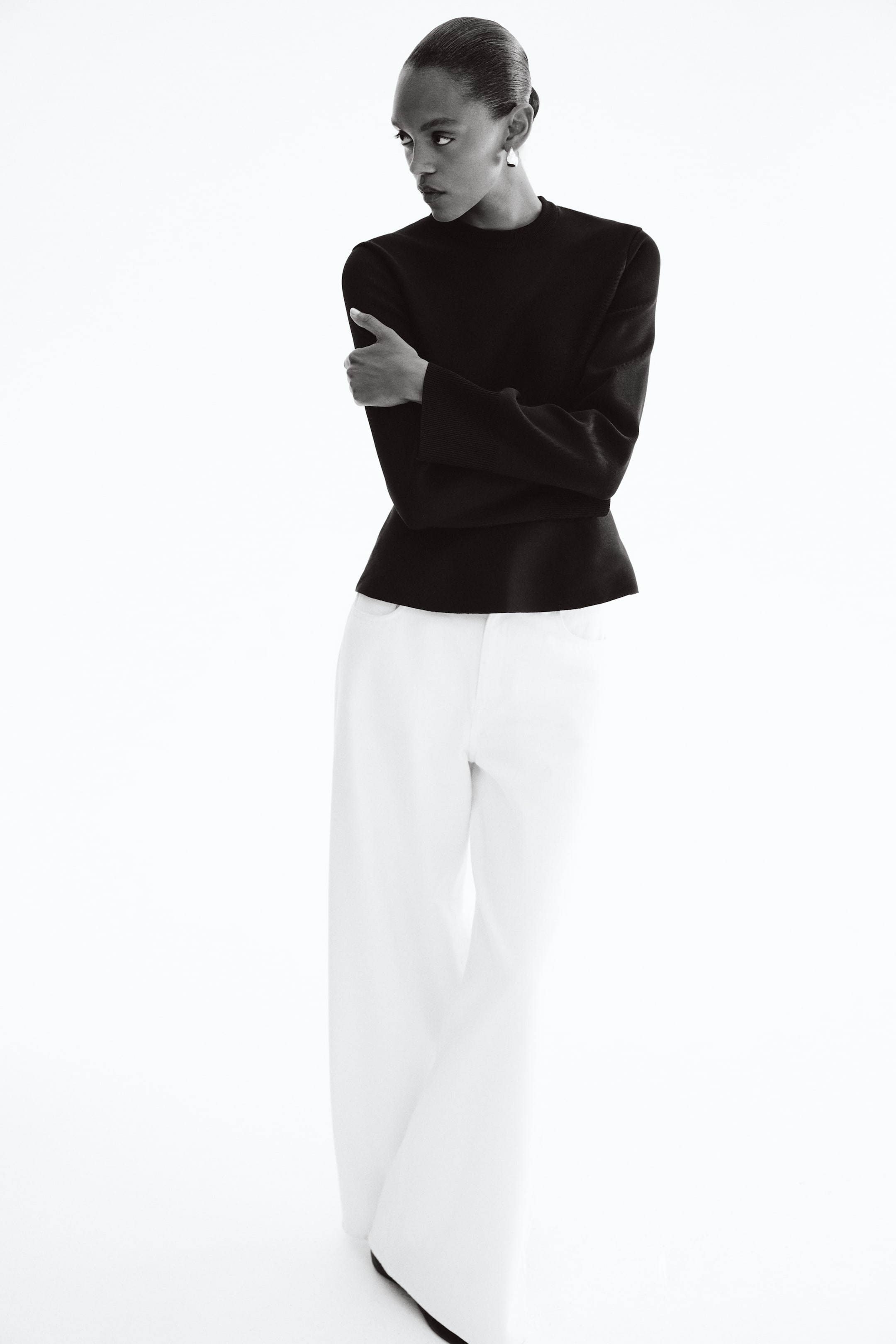 Kalıplı jarseden, ribana şeritli yuvarlak yakalı, uzun kollu, beli şekillendirici dikişli, kloş peplumlu, bedene oturan üst.