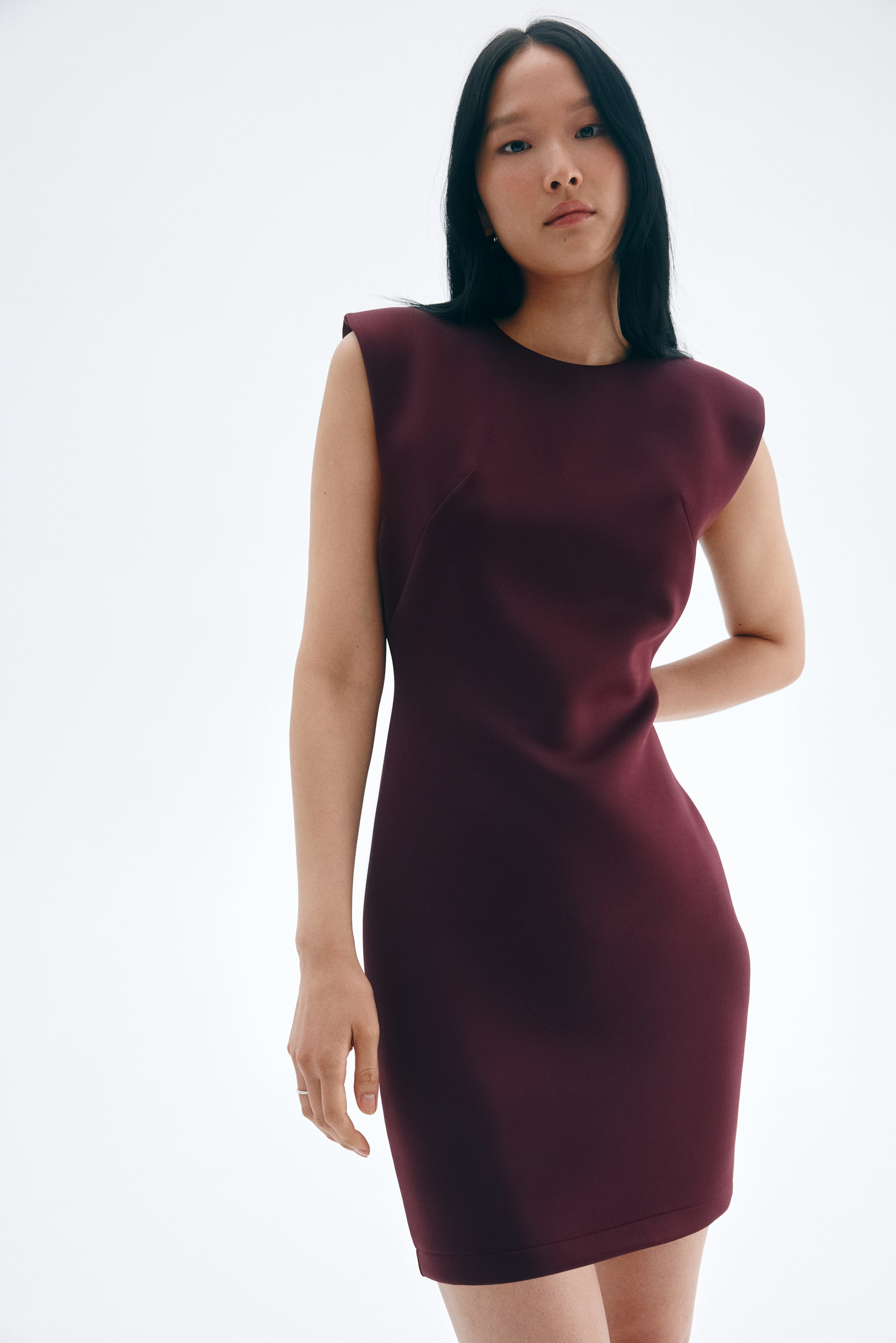 İnterlok jarseden, yuvarlak yakalı, göğüs kısmı pensli, bedene oturan kısa elbise. Kolsuz tasarımlı, omuzları vatkalı. Astarlı.