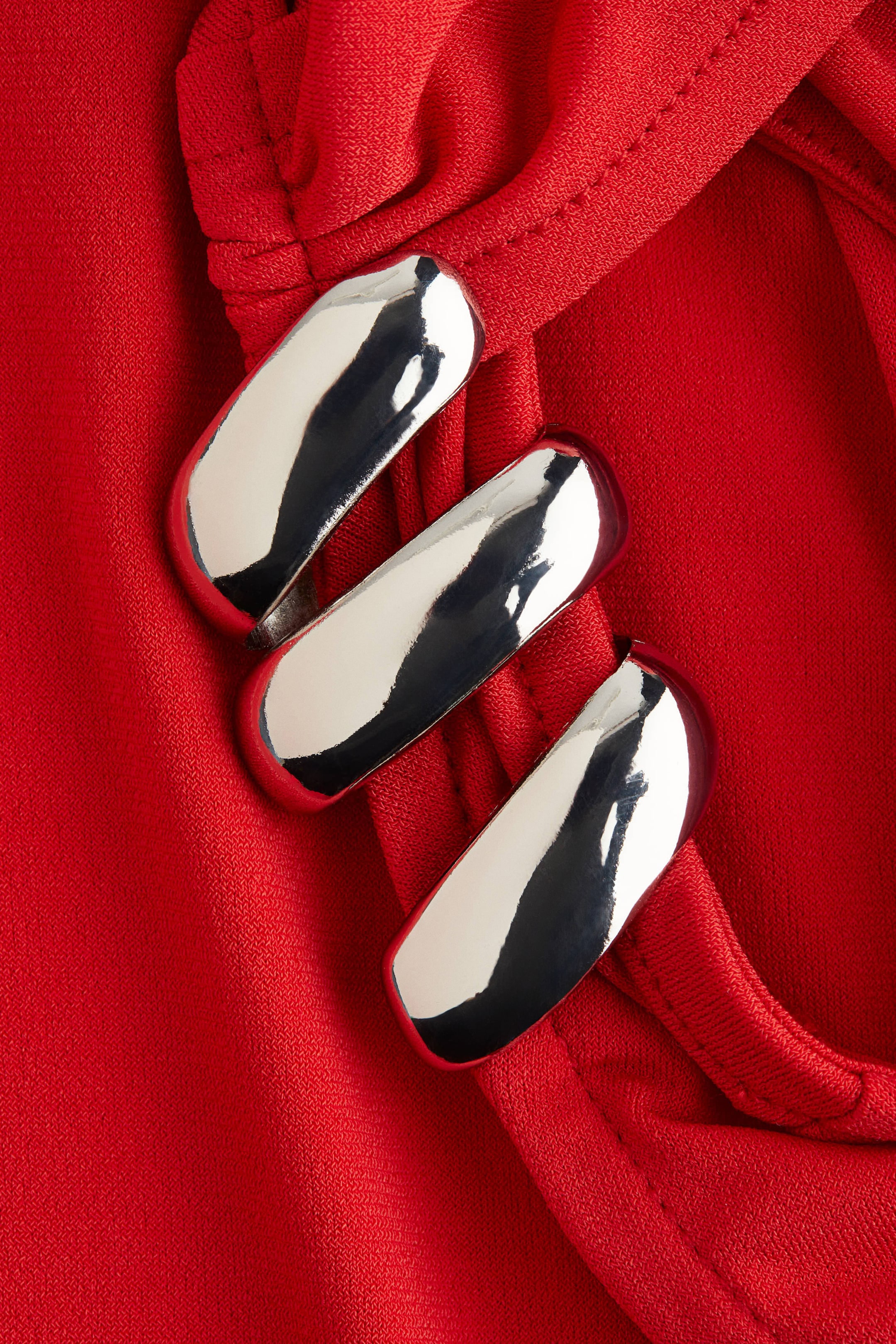 Streç jarseden, asimetrik yakalı, dekoratif metal detaylı bir omuz askılı, bedene oturan kolsuz üst. Hafif drapeli görünüm için belinin bir yanı büzgülü.