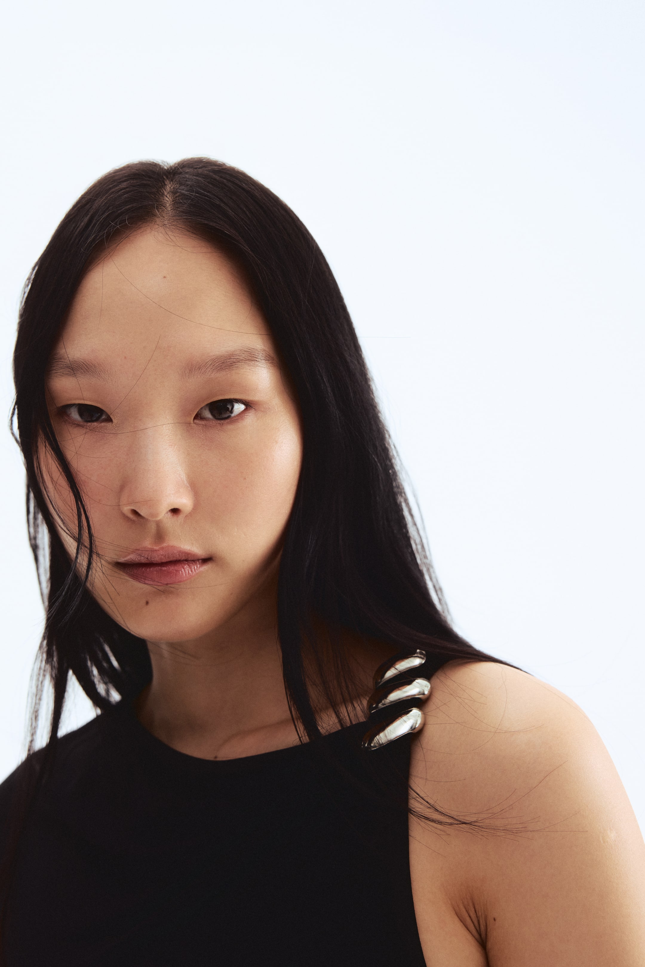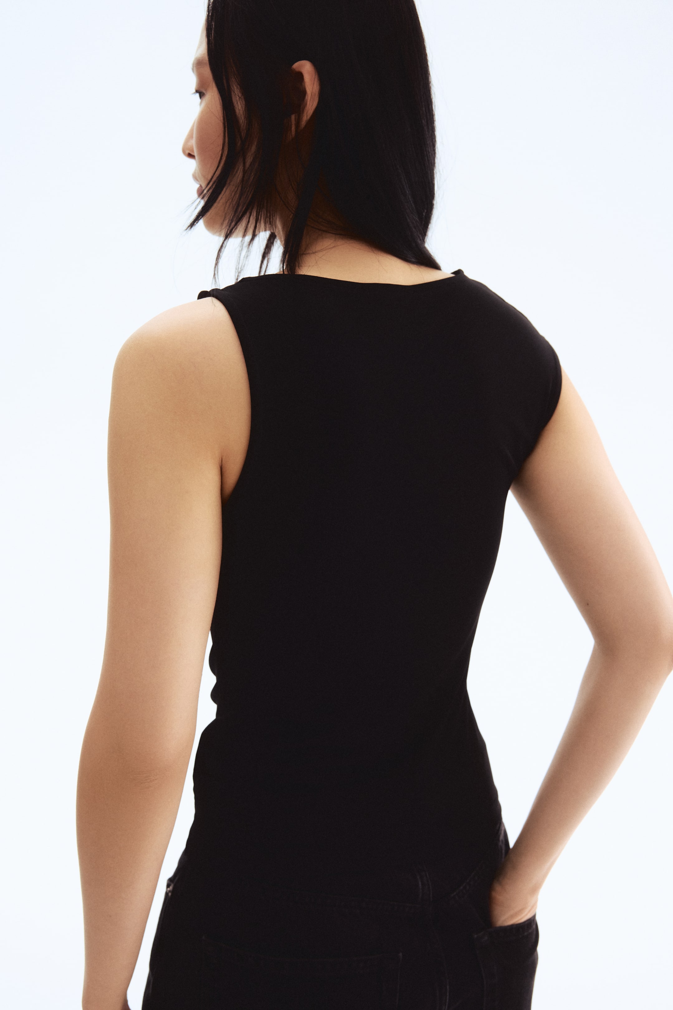 Streç jarseden, asimetrik yakalı, dekoratif metal detaylı bir omuz askılı, bedene oturan kolsuz üst. Hafif drapeli görünüm için belinin bir yanı büzgülü.