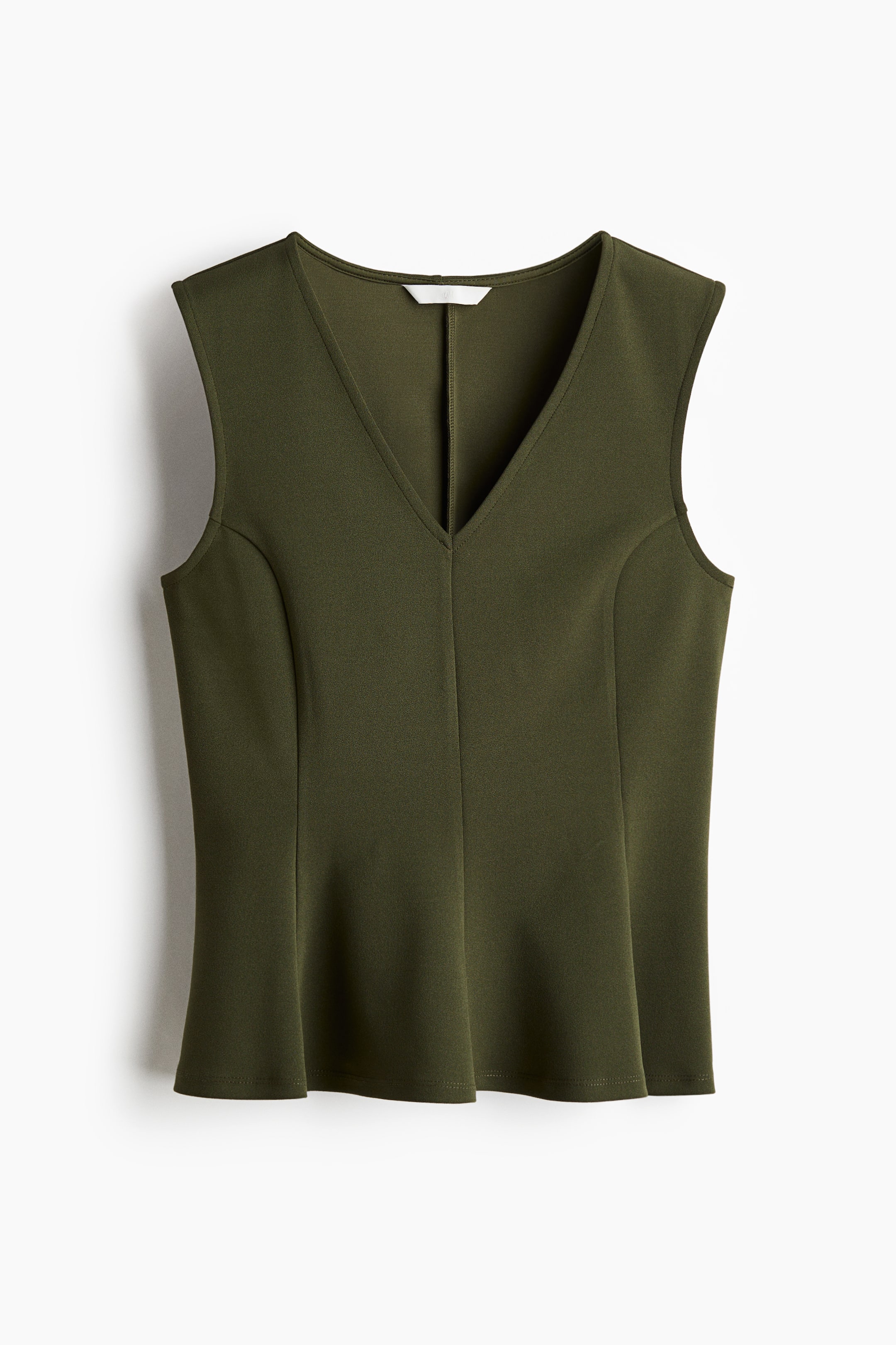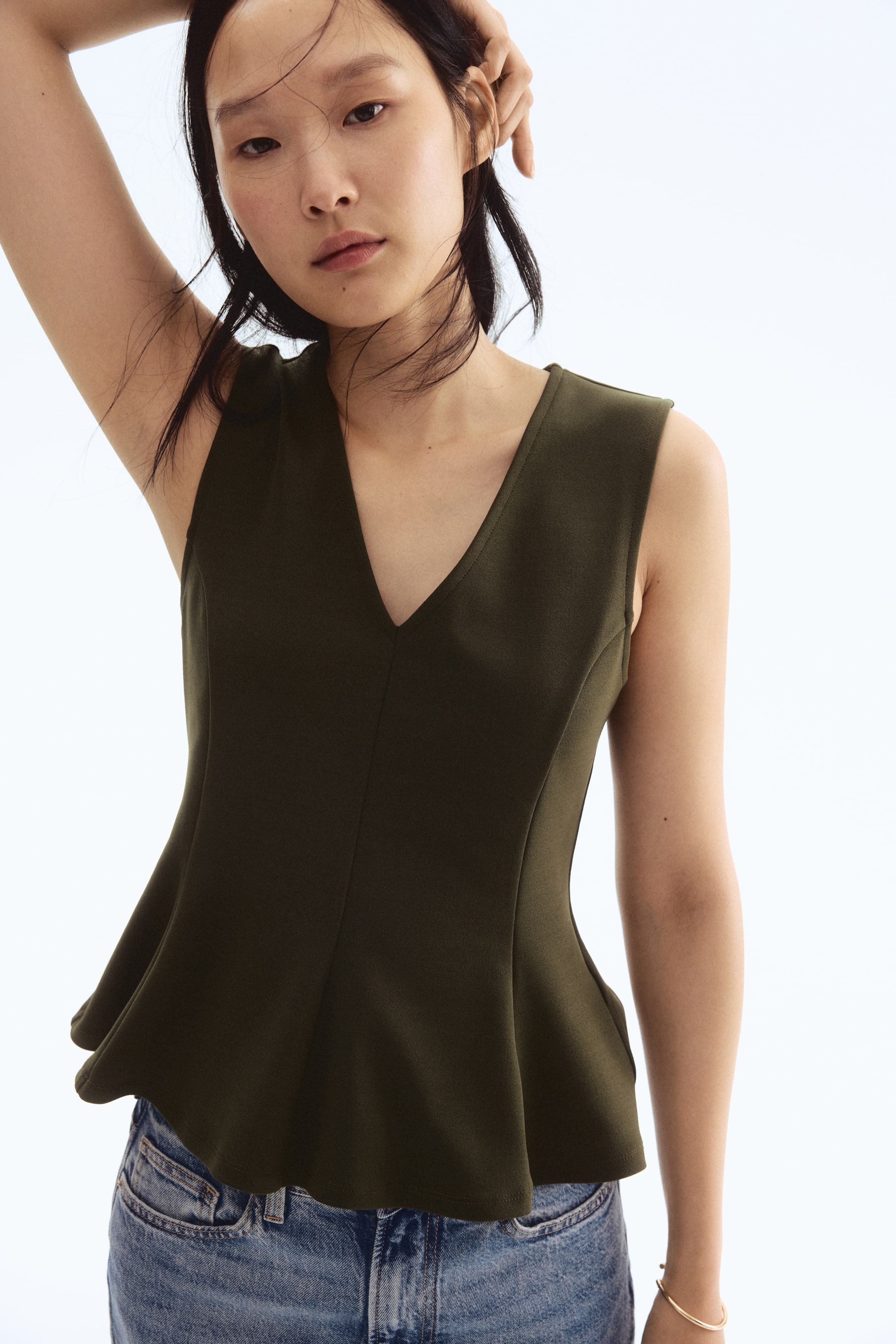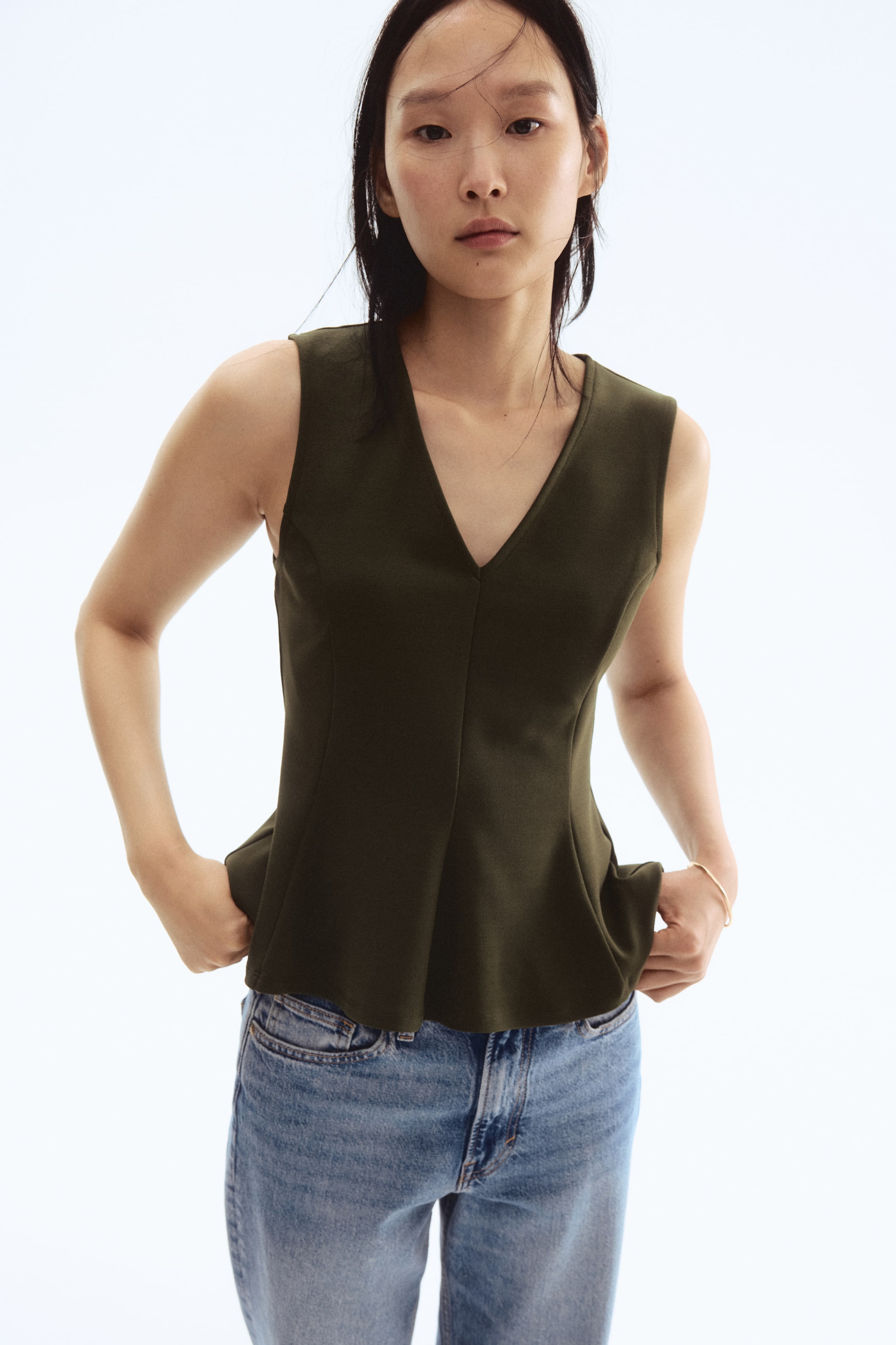 Kalın interlok jarseden, V yakalı, peplumlu, bedene oturan kolsuz üst.