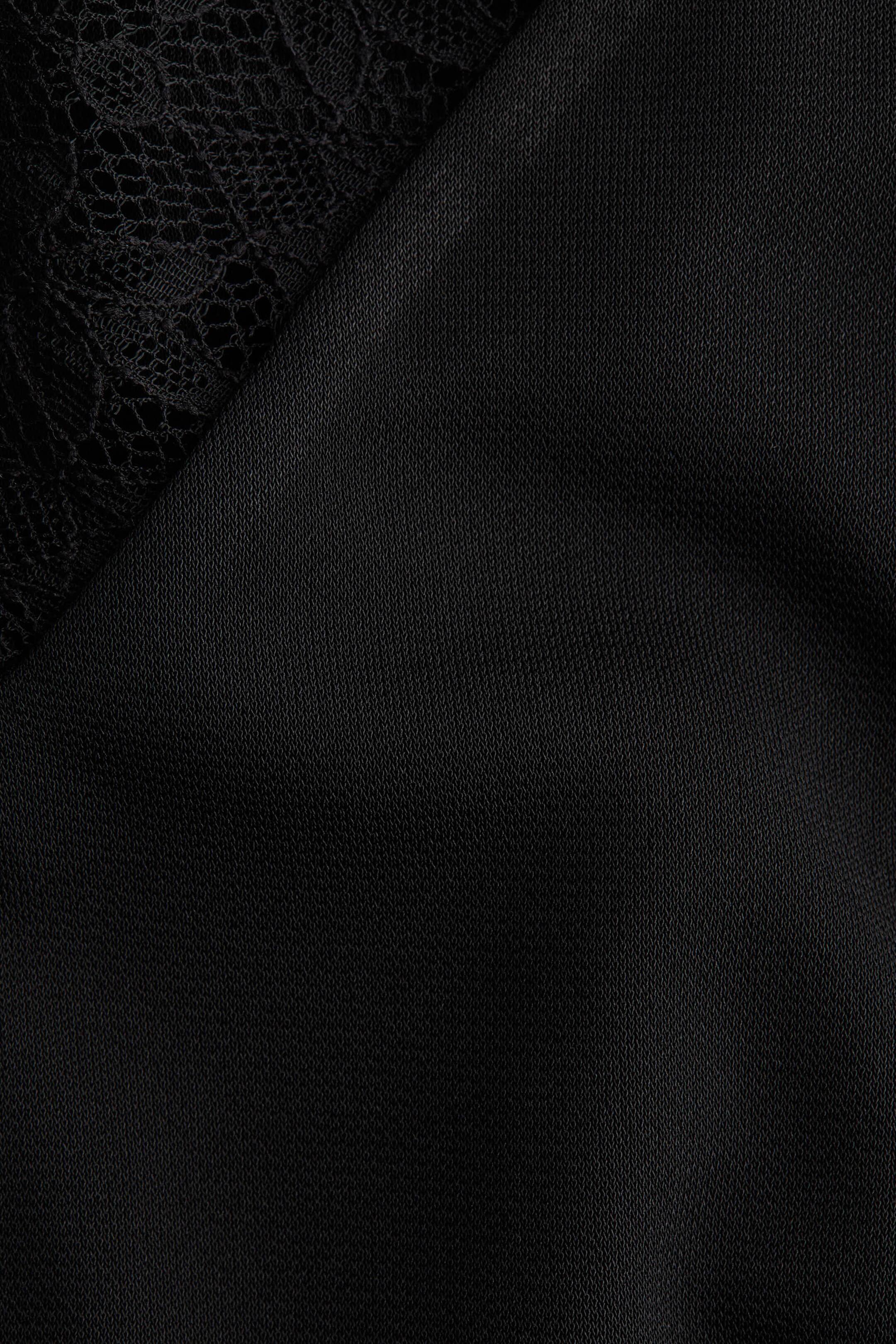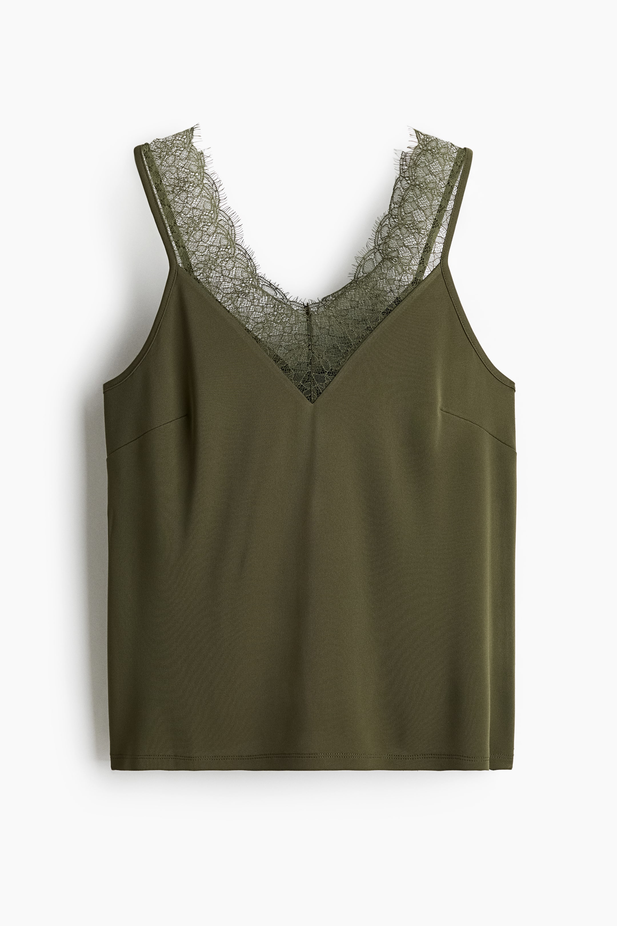 İnterlok jarseden, önü ve arkası dantel şeritli V yakalı, askılı, bedene oturan üst.