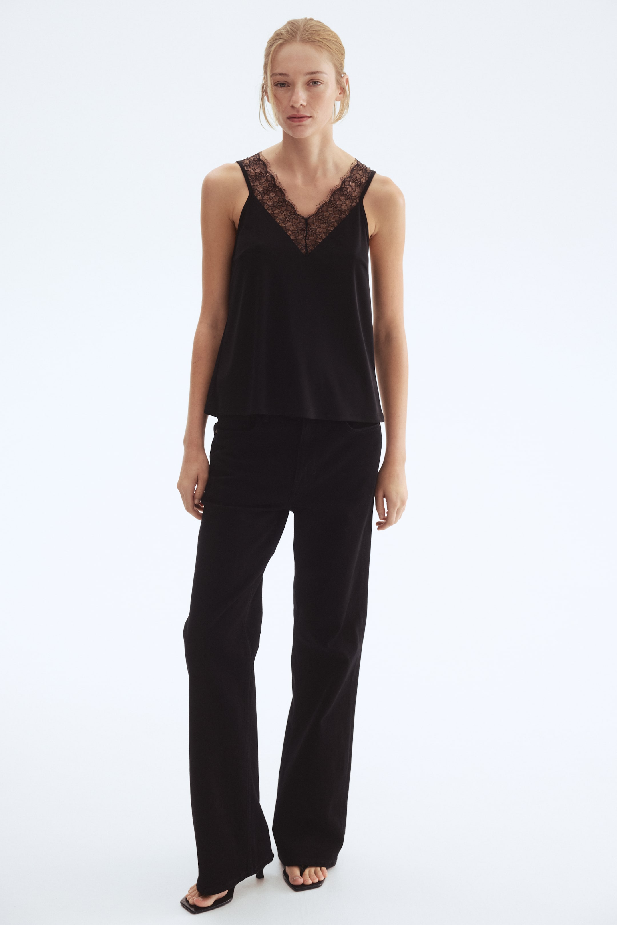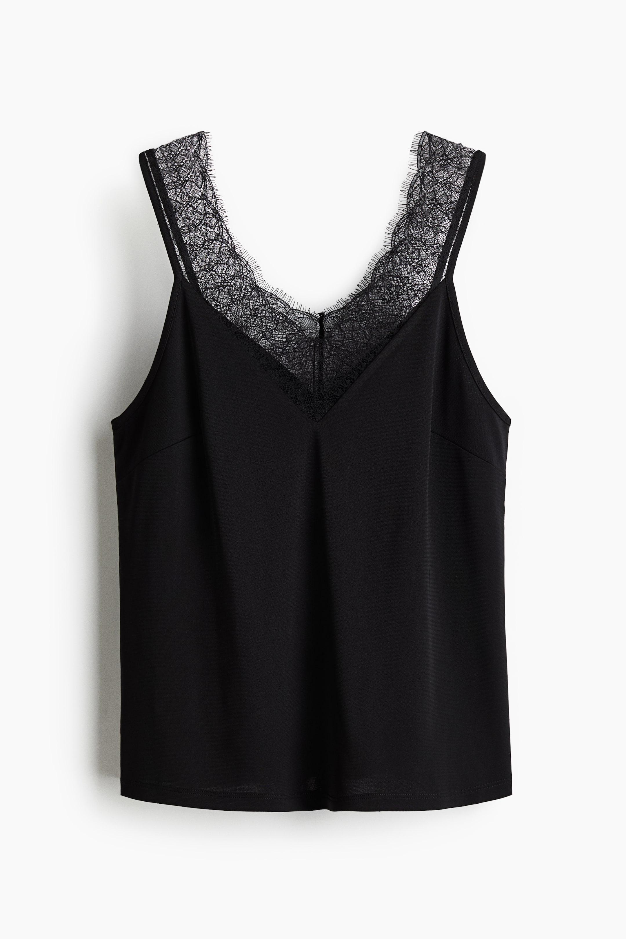 İnterlok jarseden, önü ve arkası dantel şeritli V yakalı, askılı, bedene oturan üst.