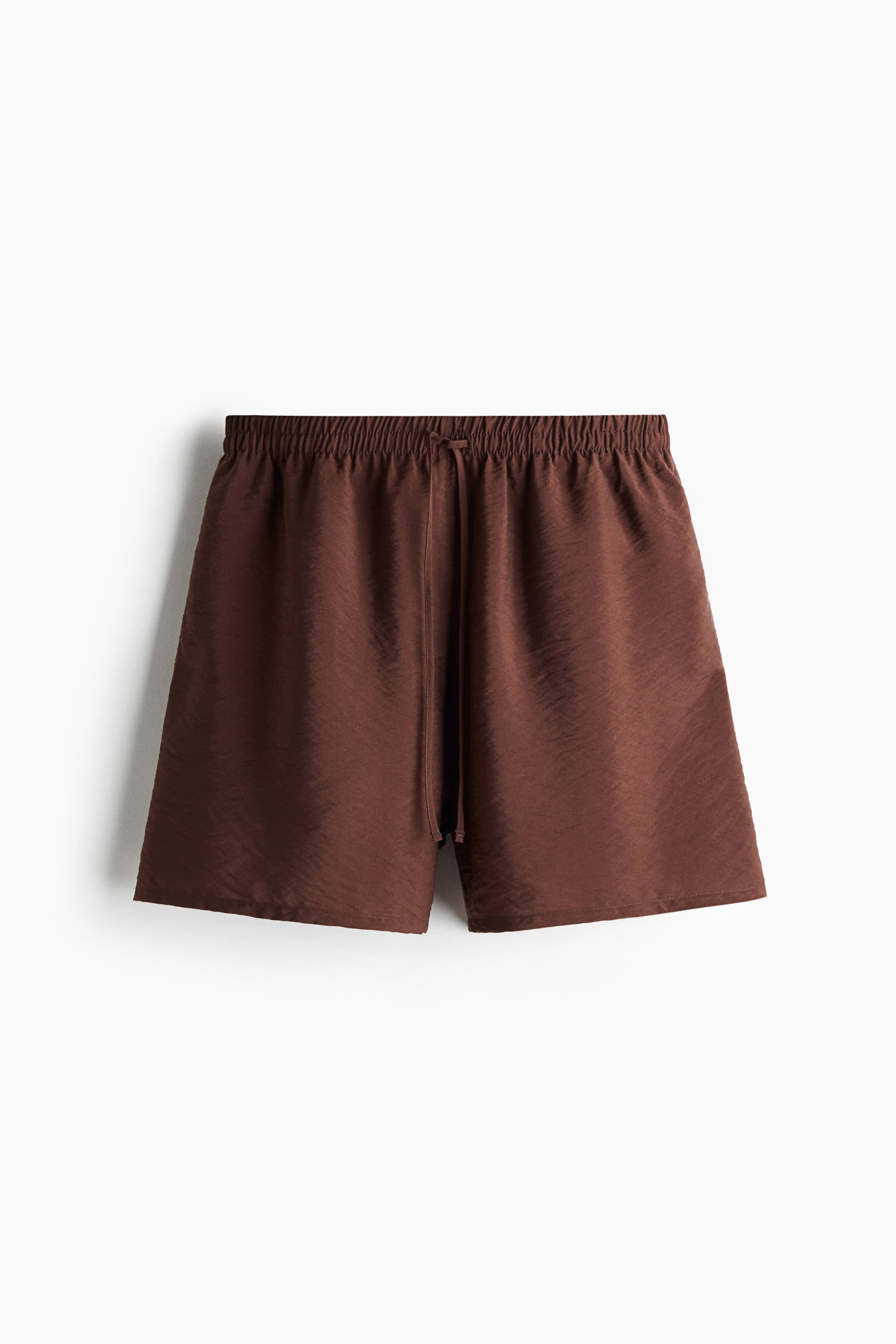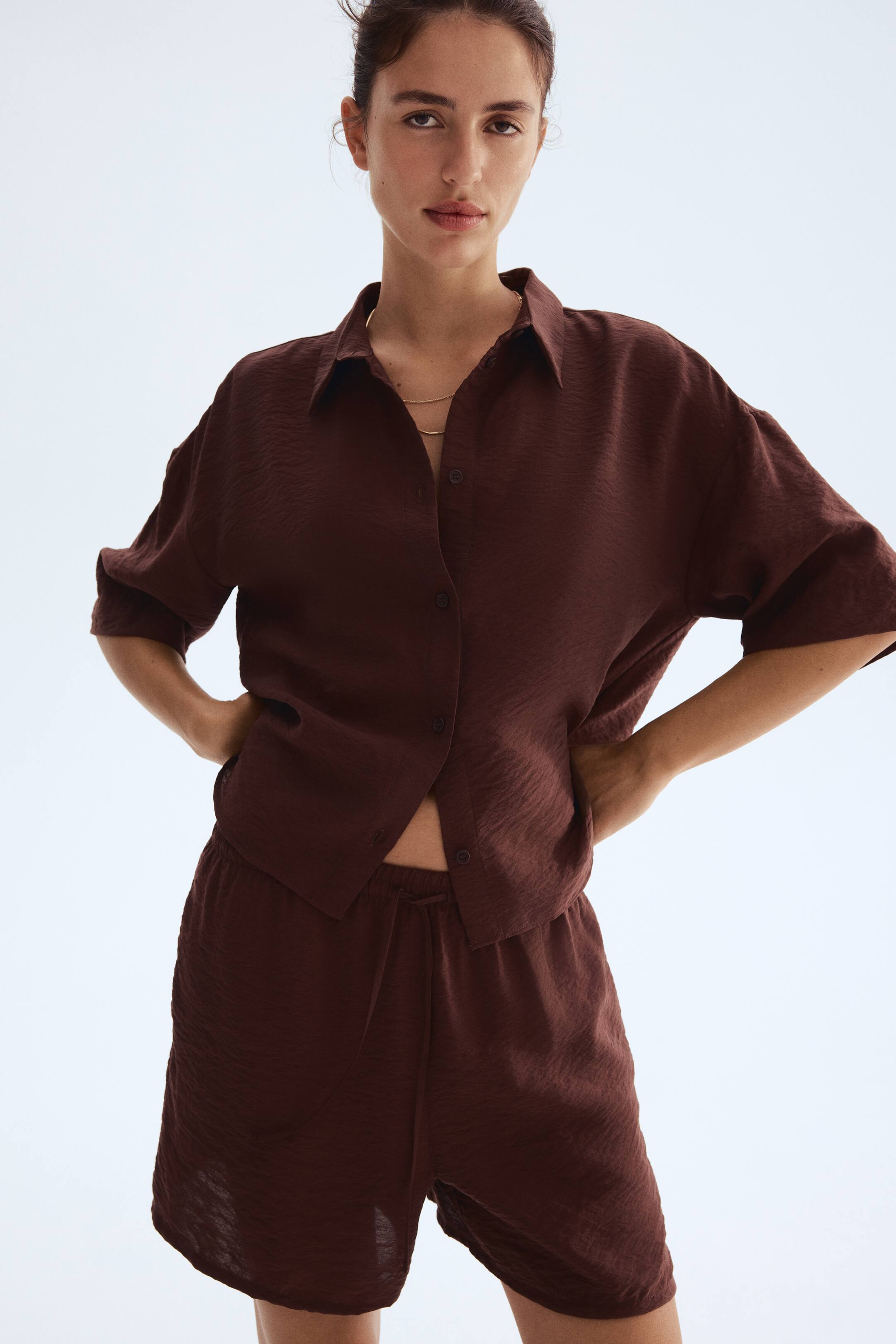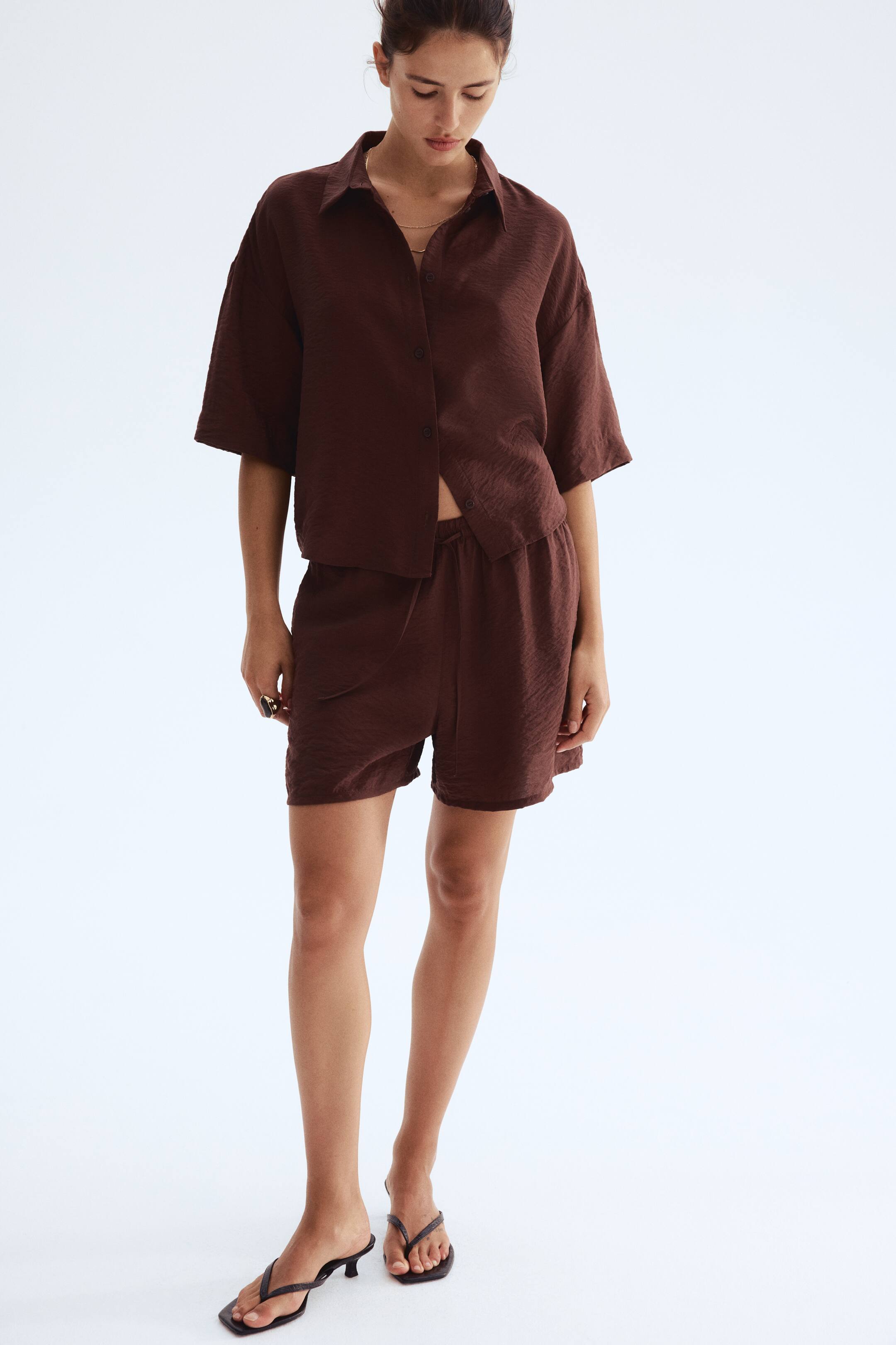 Viskoz karışımlı dokuma kumaştan, beli lastikli ve büzgü bağlı, gizli yan cepli, bol kesimli şort. Pamuklu astarlı.