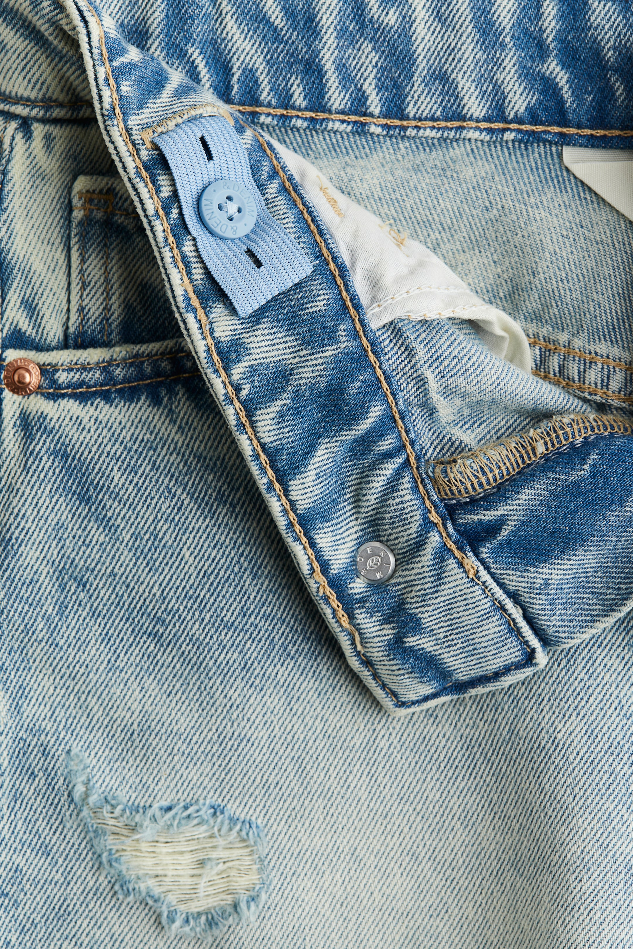 Quần short 5 túi bằng cotton denim với cạp co giãn điều chỉnh được, nẹp khoá kéo với khuy và gấu viền thô.