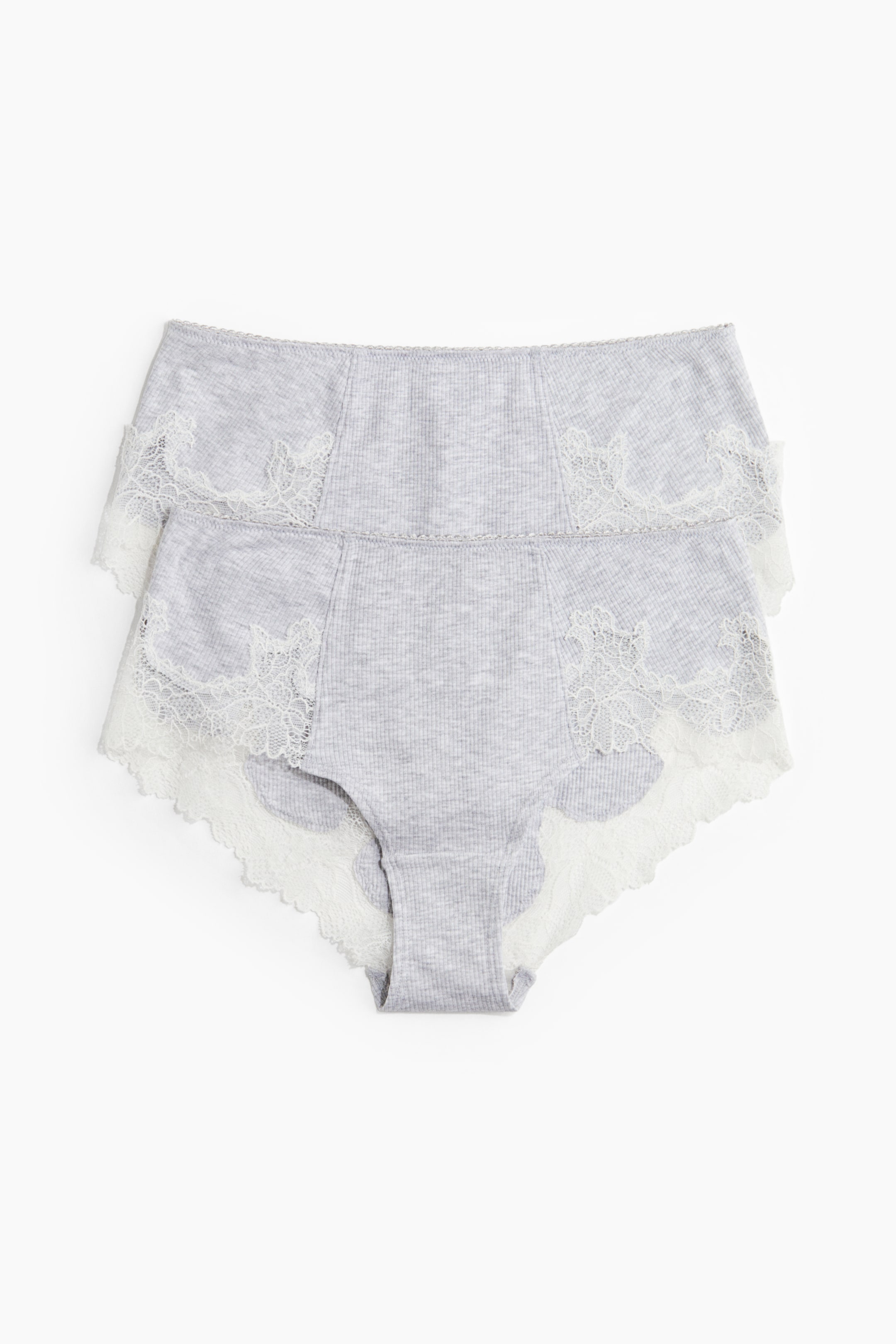 Quần lót bằng cotton jersey gân nổi có viền ren tinh tế. Cạp cao, đũng có lớp lót và phía sau che vừa.