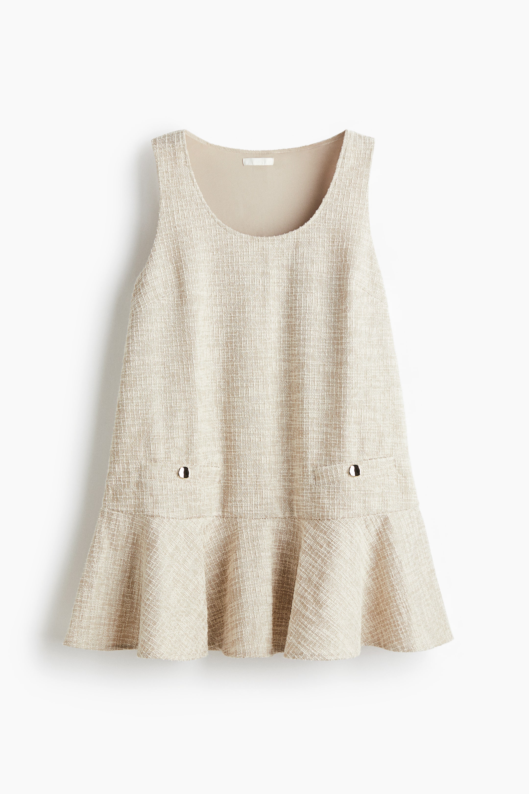 Váy ngắn, không tay dệt thoi hoa văn. Có dáng chữ A với cổ tròn, ly chiết ở ngực, túi giả mổ viền có khuy ở phía trước và vạt xoè. Có lót một phần.