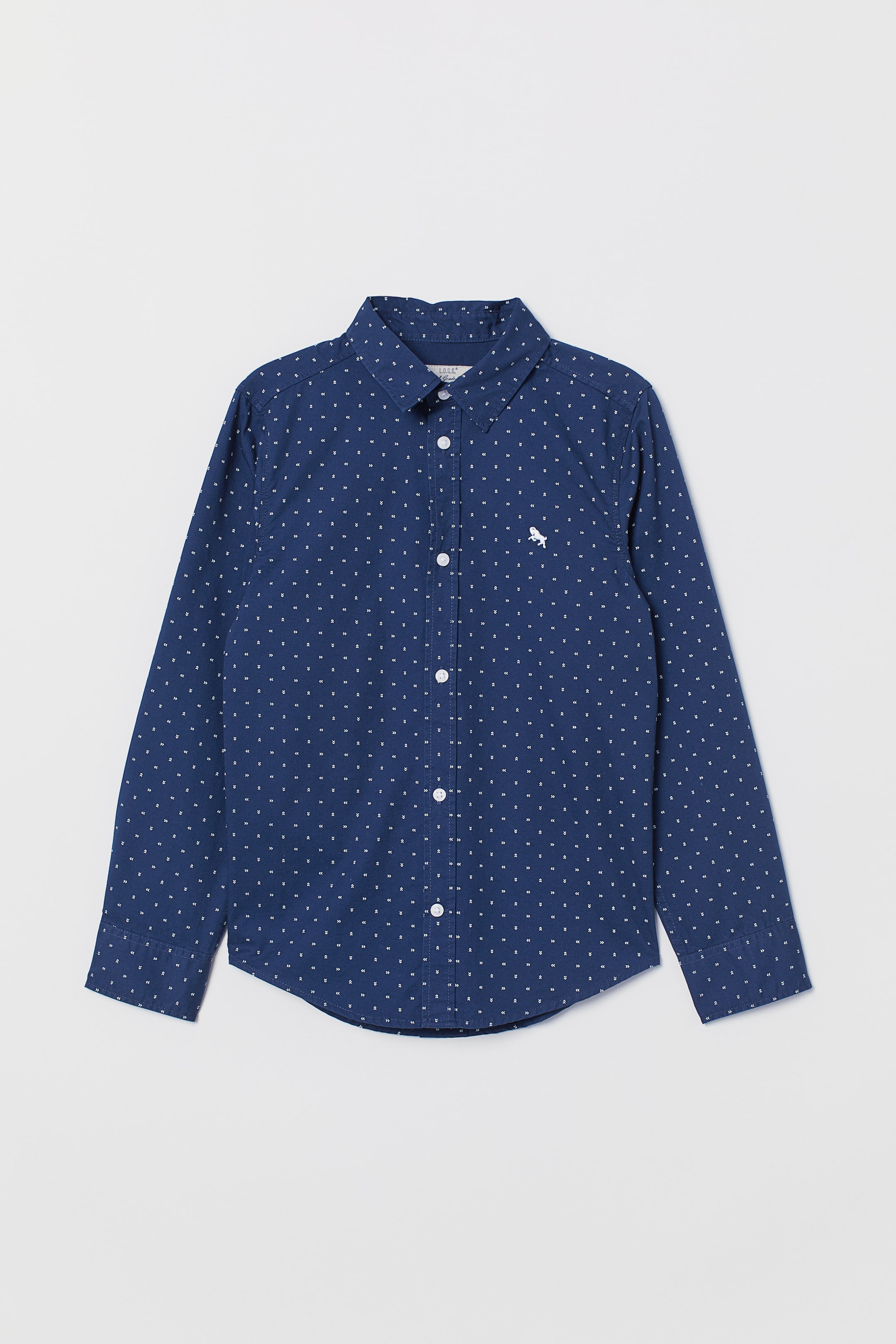 棉質平織襯衫,翻領,正面鈕扣開襟,胸前有小刺繡細節,長袖袖口配鈕扣,領座和袖口內側為對比色。
