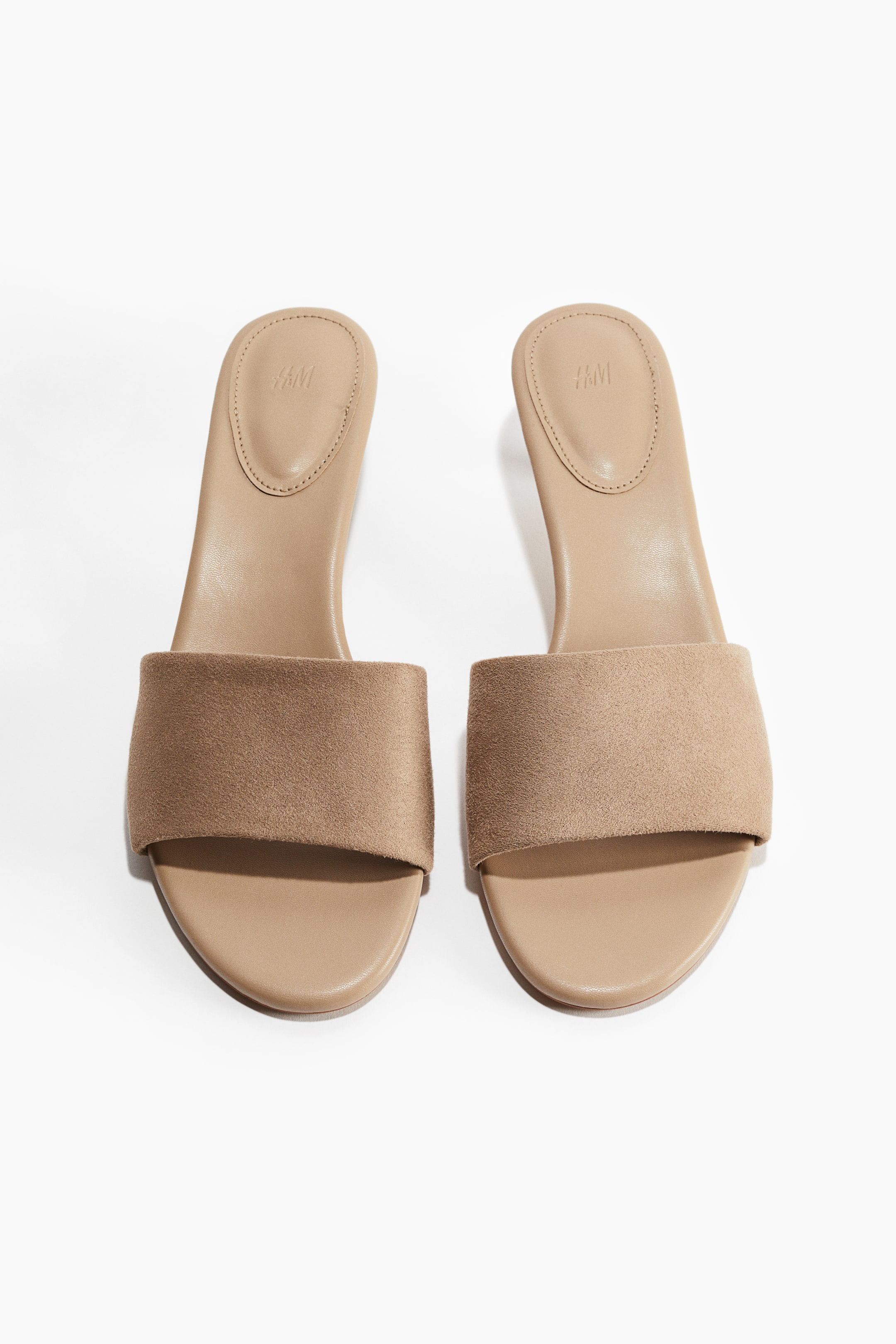 圓頭涼鞋,鞋面有寬飾帶,中跟設計。