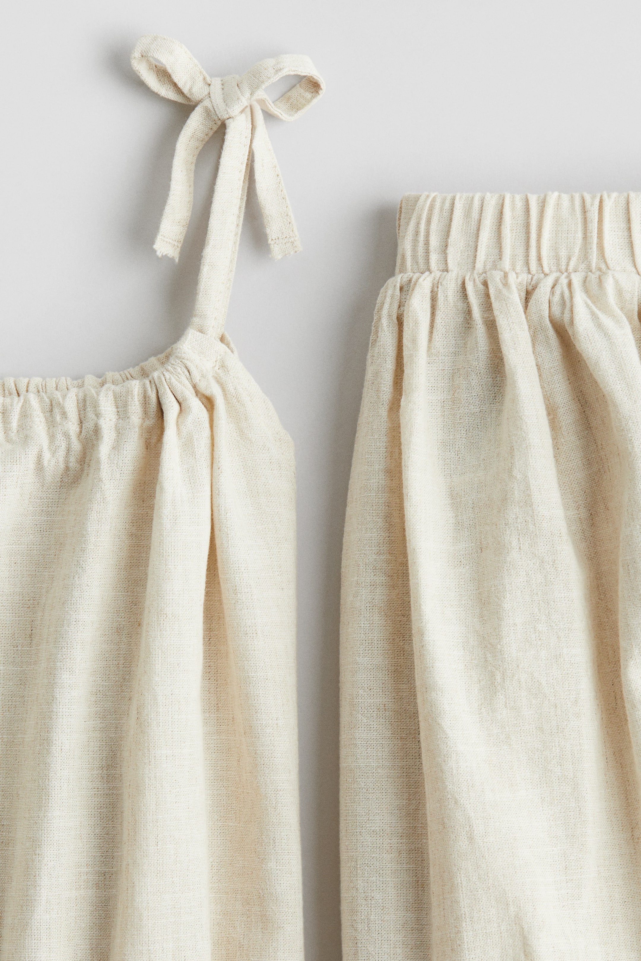 透氣棉麻混紡平織套裝,含細肩帶上衣和裙子。傘狀上衣,圓領,細肩帶上部有縫固蝴蝶結;裙子,覆面鬆緊帶腰圍,裙襬有荷葉飾邊。