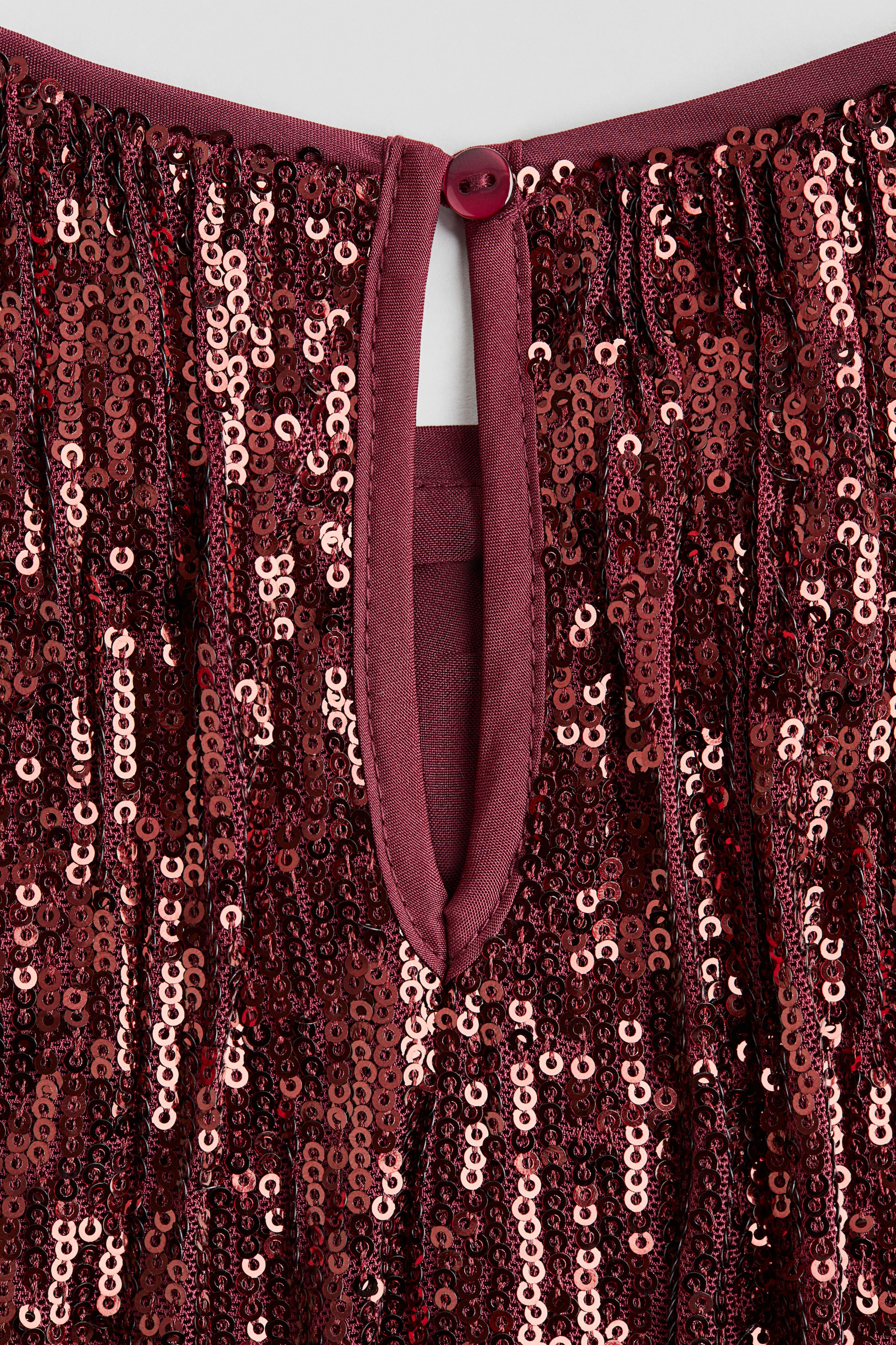 亮片網紗洋裝,圓領有抓褶,短袖款式,背面鎖眼開口配單顆鈕扣。領口、袖口和裙襬有飾邊。有內裡。