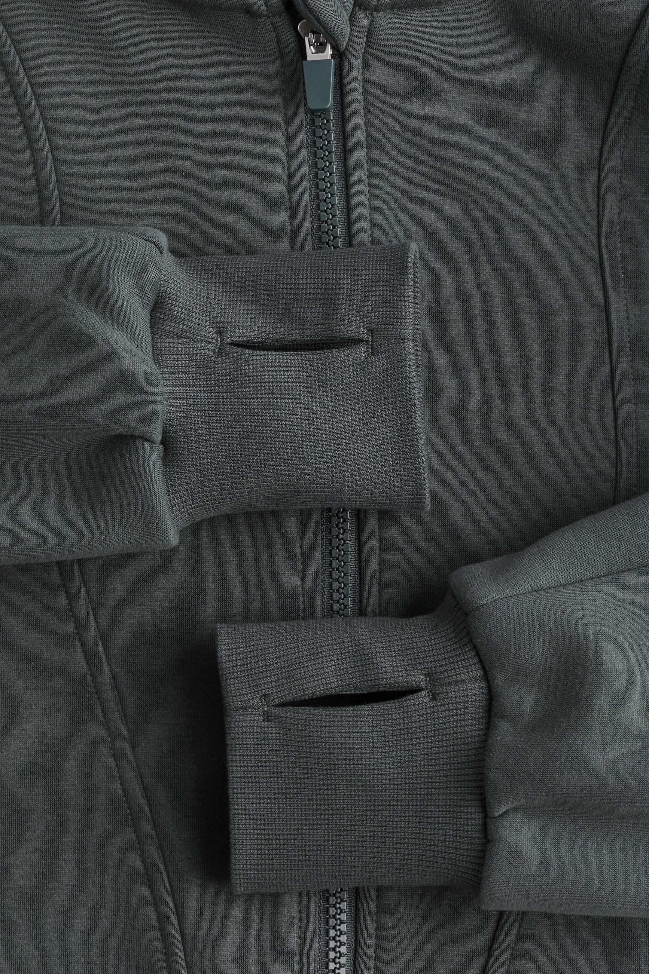 短版運動連帽外套,汗衫布料,柔軟刷毛內裡,寬鬆剪裁,正面拉鍊有防磨擋布,長拼接袖,羅紋袖口和下襬。