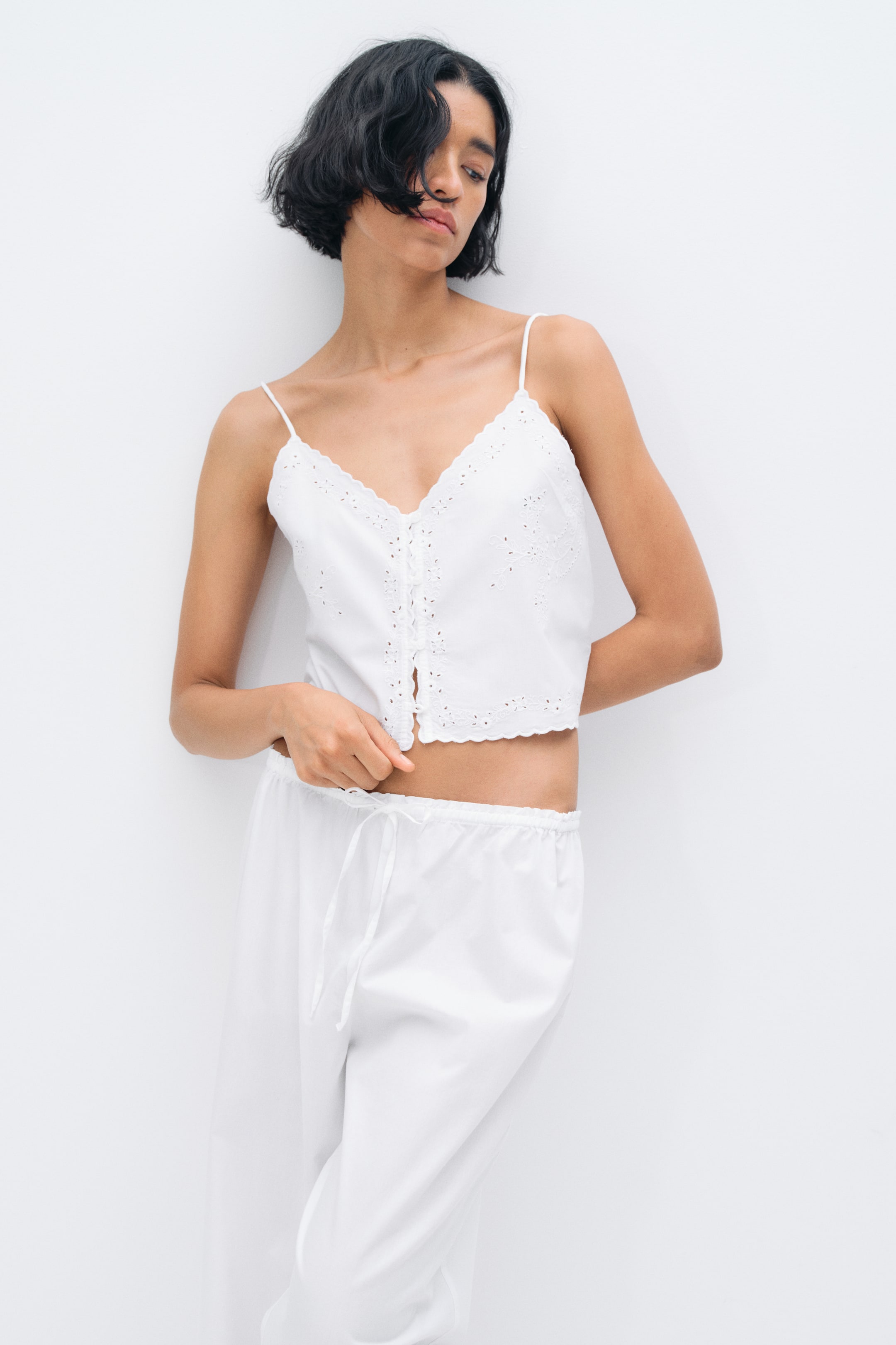 透氣棉質平織睡衣套裝,含細肩帶上衣和睡褲,有英式鏤空刺繡和小波浪邊。短版細肩帶上衣,V領,前開式設計配鈕扣;睡褲,低腰剪裁,鬆緊帶腰圍配細抽繩,上部有小荷葉飾邊。