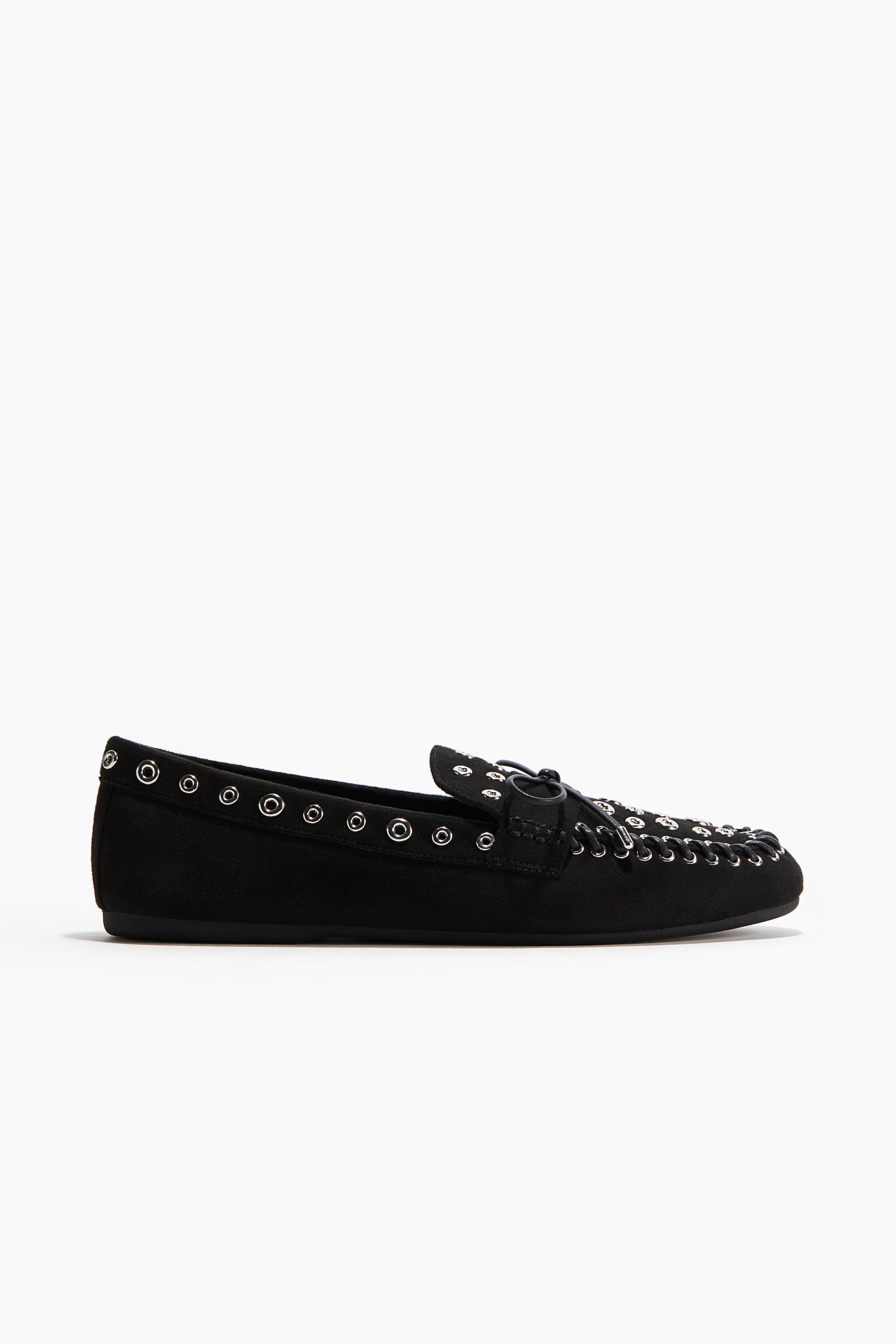 樂福鞋,柔軟起絨表面,綴滿金屬孔眼,鞋面有蝴蝶結飾和莫卡辛風格縫線。棉質斜紋內裡。