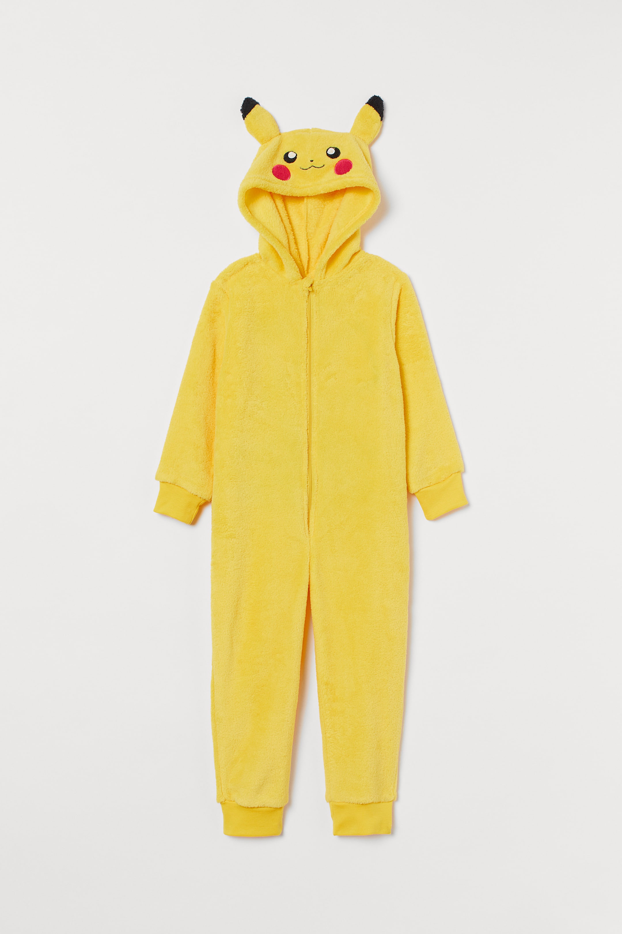 化裝舞會道具服,柔軟厚絨毛布料,連衣帽有貼花,正面拉鍊有防磨擋布,羅紋袖口和褲腳。