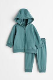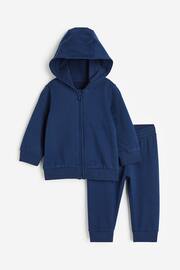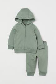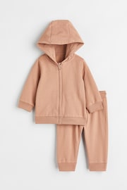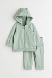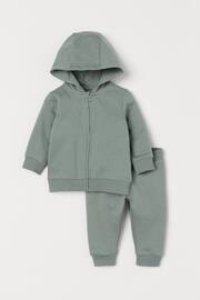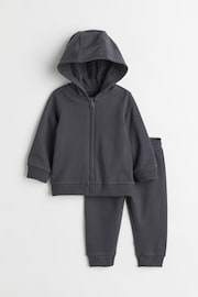 柔軟棉質汗衫布料套裝,含拉鍊連帽外套和長褲。連帽外套,連衣帽有平紋內裡,正面隱形拉鍊有防磨擋布,羅紋袖口和下襬;長褲,鬆緊帶腰圍配抽繩,羅紋褲腳。柔軟刷毛內裡。