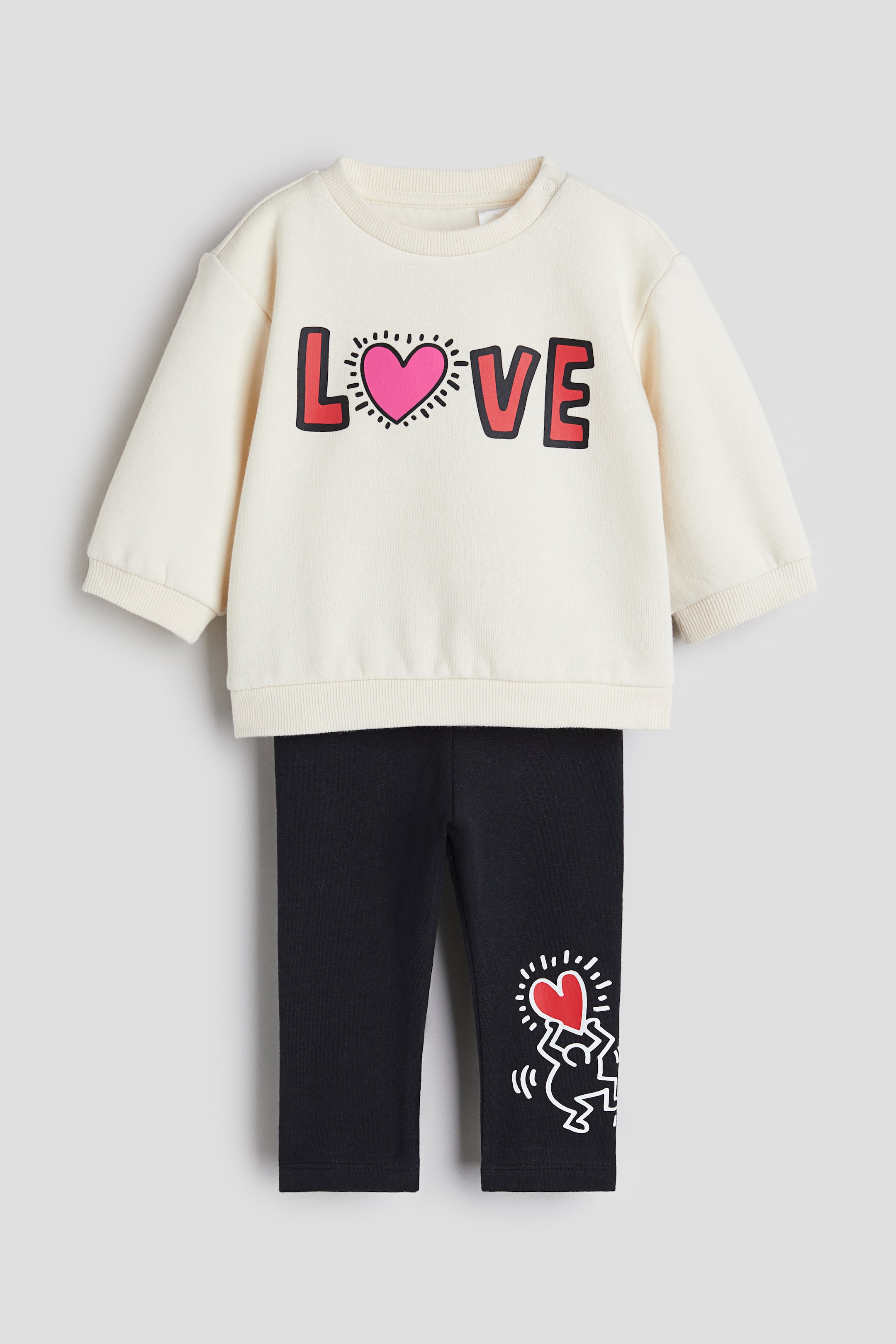 套裝,含上衣和長褲。圖案上衣,棉質汗衫布料,垂肩長袖,單肩有按扣(尺寸98–104無按扣),羅紋領口、袖口和下襬;長褲,柔軟棉質平紋布料,可調式鬆緊帶腰圍。