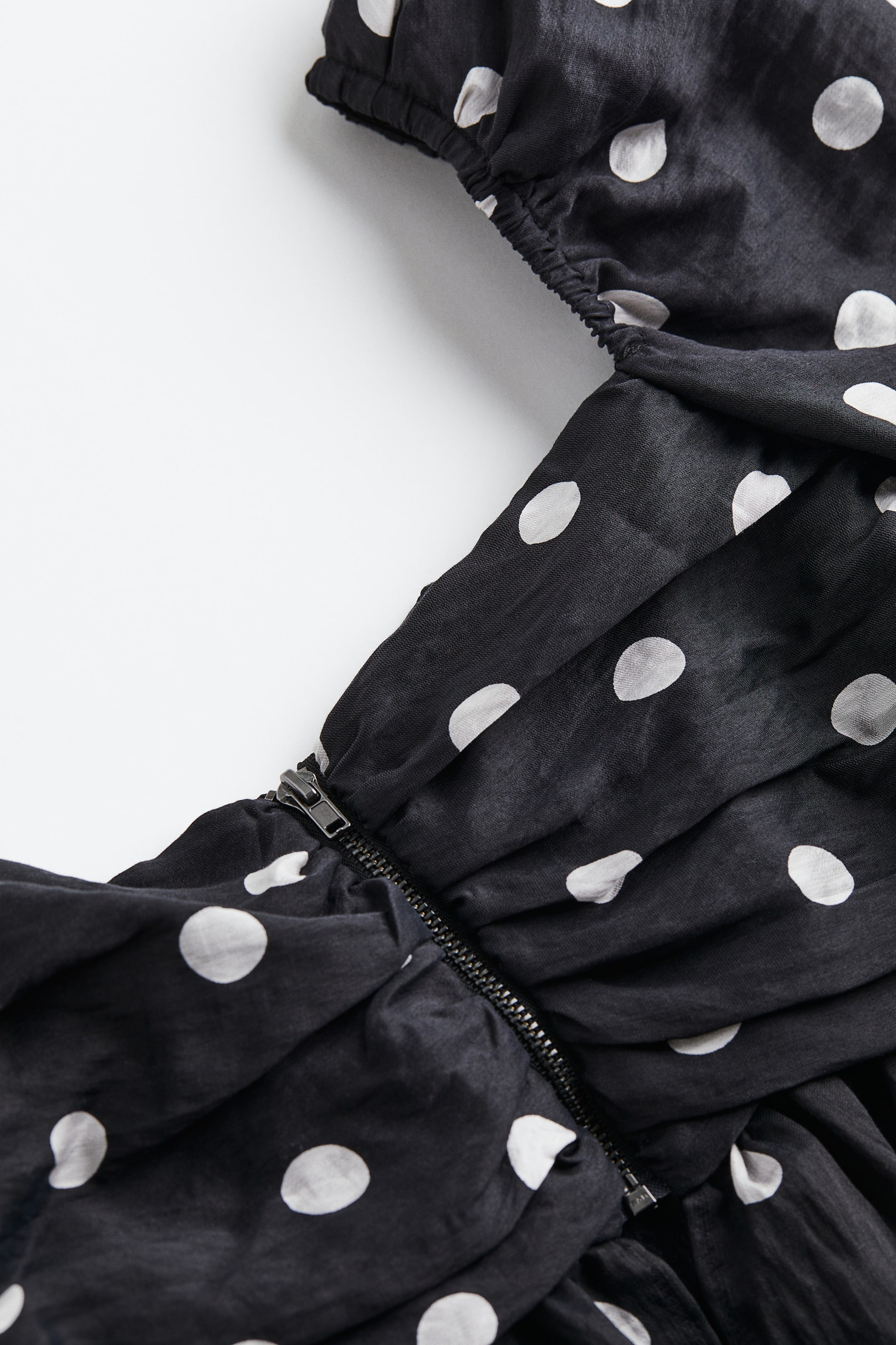短版女衫,微亮面Tencel™萊賽爾天絲混紡平織布料,桃心領,長公主袖,肩部有細鬆緊帶,喇叭袖口有小荷葉飾邊和隱形拉鍊。前後有抓皺,背面有拉鍊。高腰處有縫線,傘狀荷葉浪邊下襬。局部有內裡。