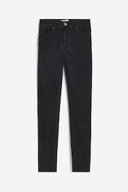 5袋式超彈性伸縮丹寧牛仔褲,如第二層肌膚般地包覆身形。腰部至褲腳為緊身設計,中腰剪裁,拉鍊門襟配鈕扣。標準褲長蓋過腳踝,褲腳不疊皺拖地。