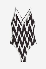 全內裡V領連身泳裝,後交叉式肩帶穿過背面小圈環後綁結,罩杯有可拆式襯墊,具塑形效果,提供良好支撐。高裁褲腳設計,背面有半包臀效果。