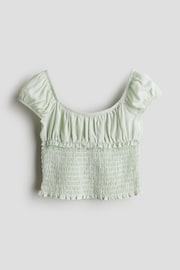褶縐平織上衣,低圓領,短公主袖,腰部縮褶布段有荷葉飾邊。領口和袖口有細鬆緊帶。