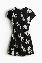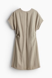 圓領短洋裝,平織布料,背面有隱形拉鍊,短袖款式。收窄腰圍有抓褶,打造微垂墜效果。無內裡。
