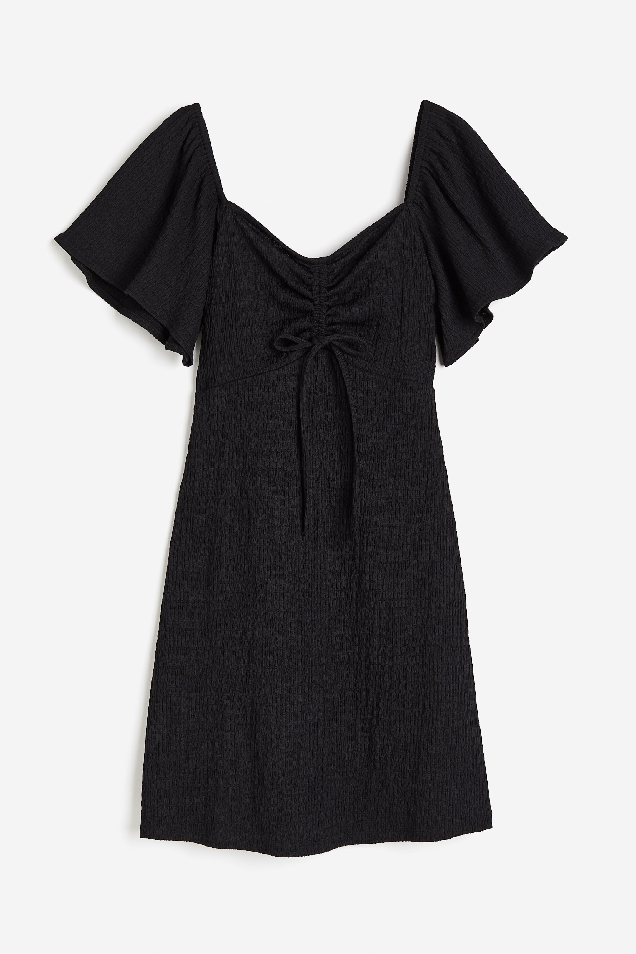 短洋裝,紋理感平紋布料,桃心領,前胸中央有細抽繩設計,蝴蝶袖,肩部和背面有細鬆緊帶,微傘狀裙襬。