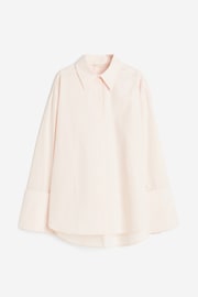 加大碼襯衫,平織布料,正面隱形鈕扣開襟,背面雙層肩襠有抓褶。垂肩設計,袖口有寬邊反折、開衩和鈕扣。微圓下襬,後襬略長。