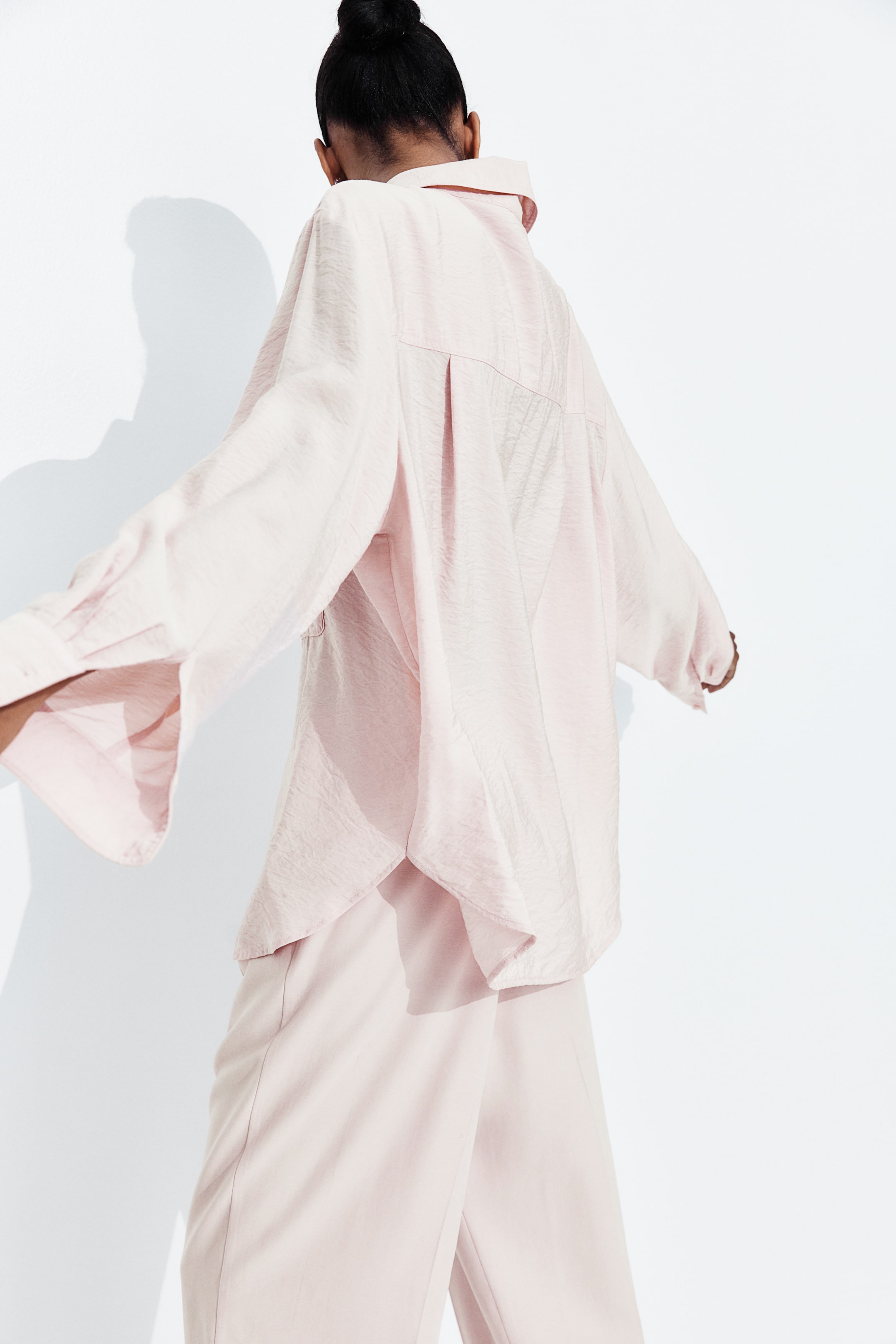 嫘縈混紡平織襯衫,正面鈕扣開襟,背面雙層肩襠有抓褶,微垂肩長袖,袖口配鈕扣,有外縫單胸袋,圓邊下襬。