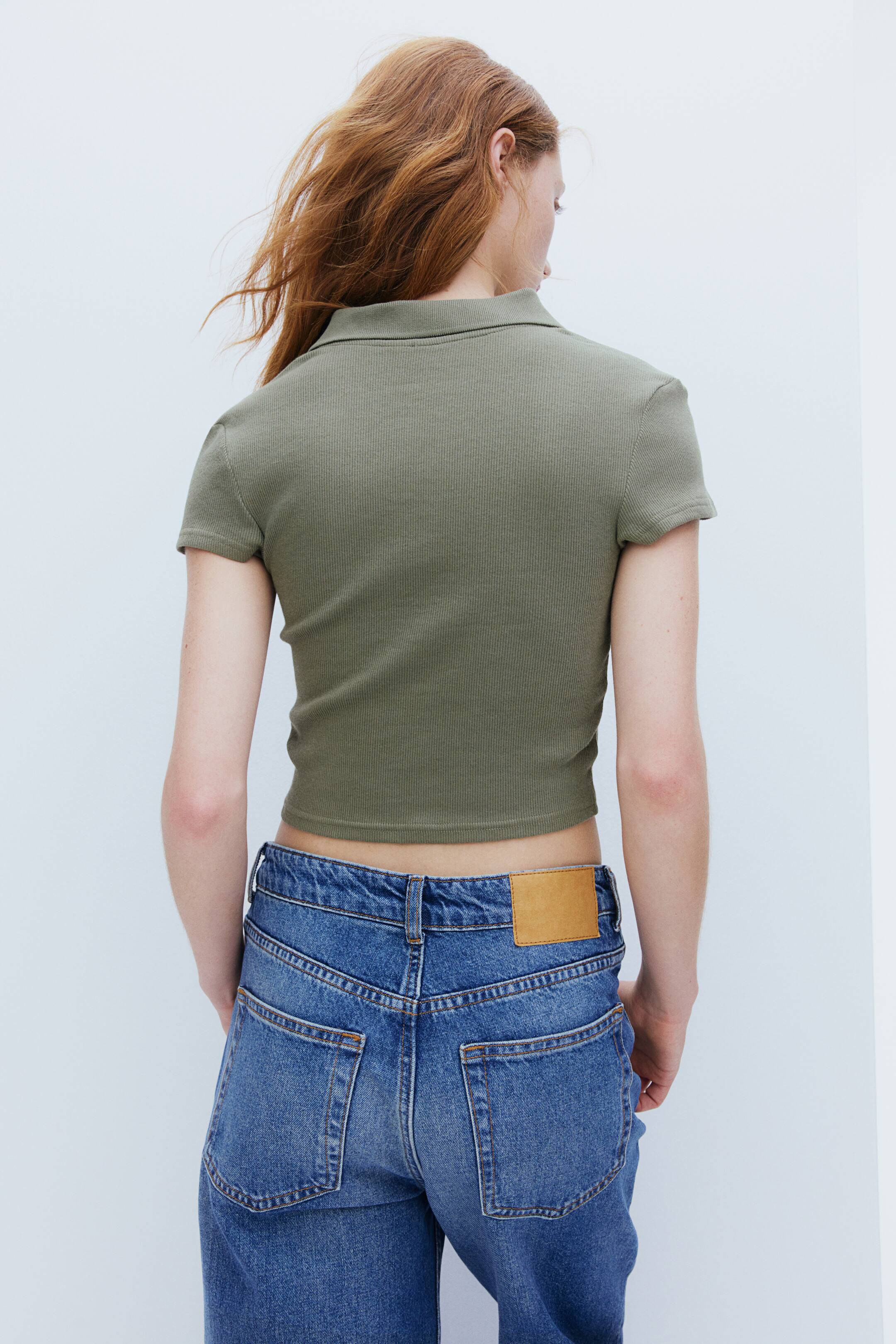 短版Polo衫,棉質羅紋平紋布料,合身剪裁,鈕扣半開襟,短袖款式。