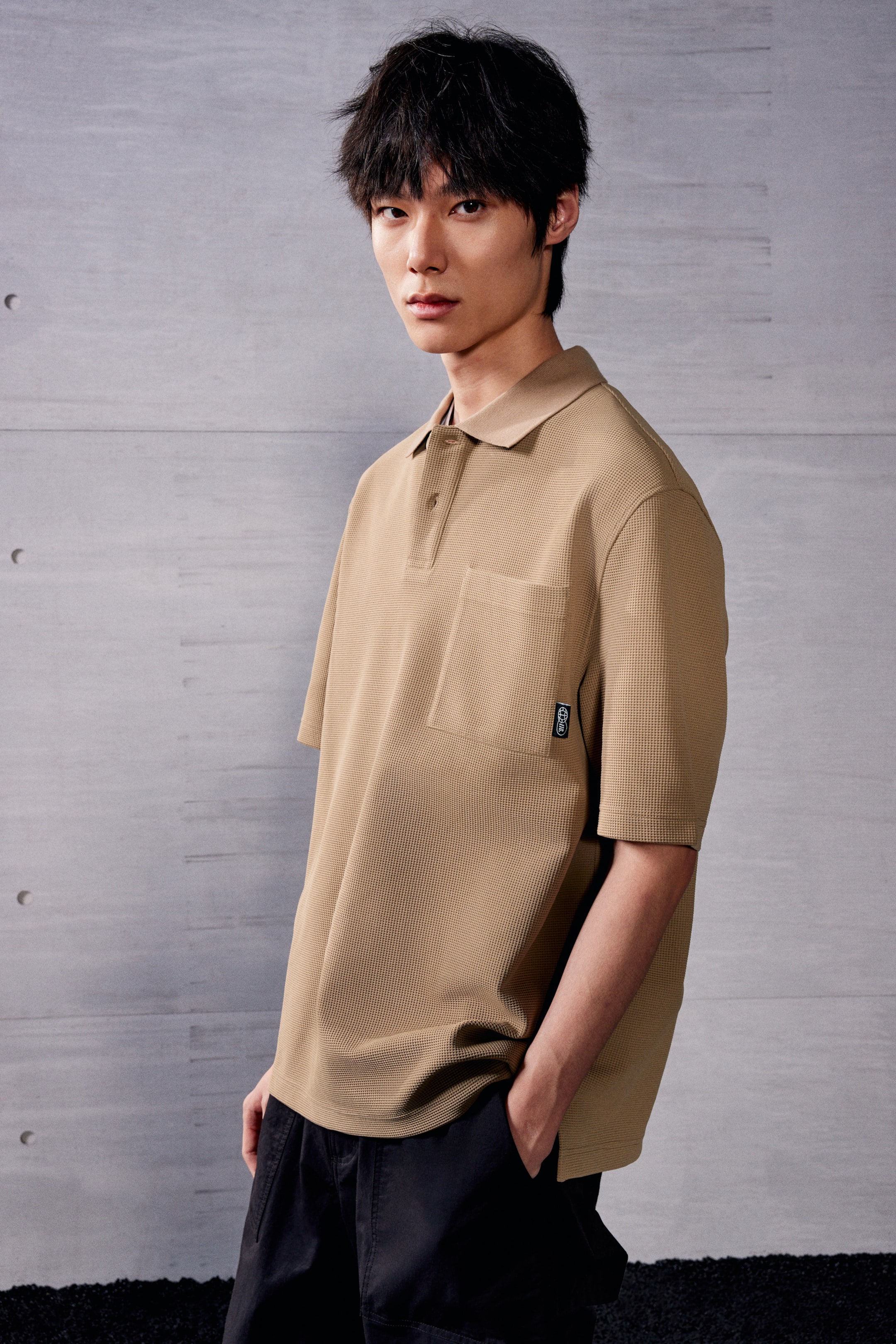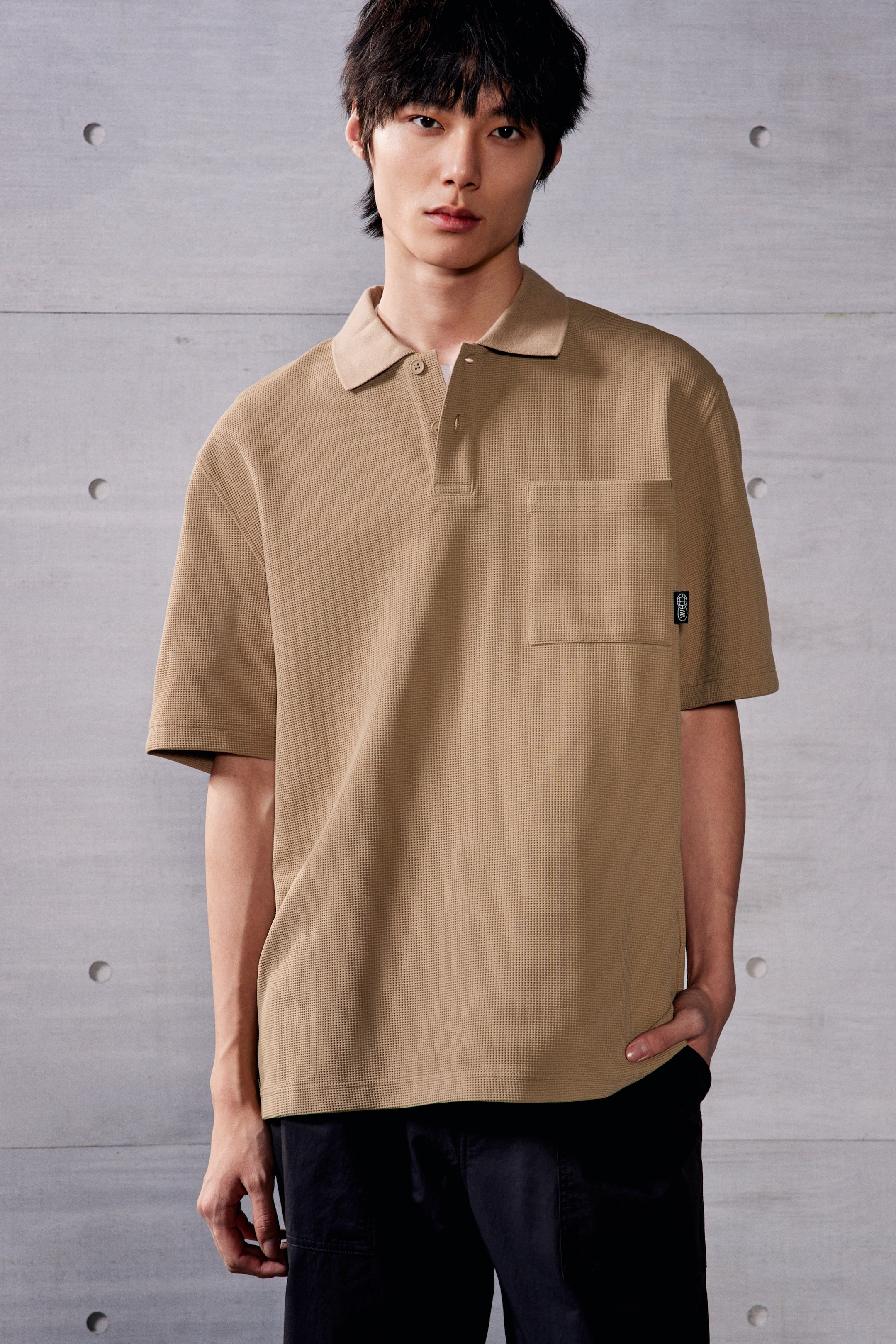 華夫格平紋Polo衫,羅紋衣領,鈕扣半開襟,短袖款式,有開口式單胸袋。平切下襬,兩側開小衩。非加大碼寬鬆剪裁,打造寬版線條。