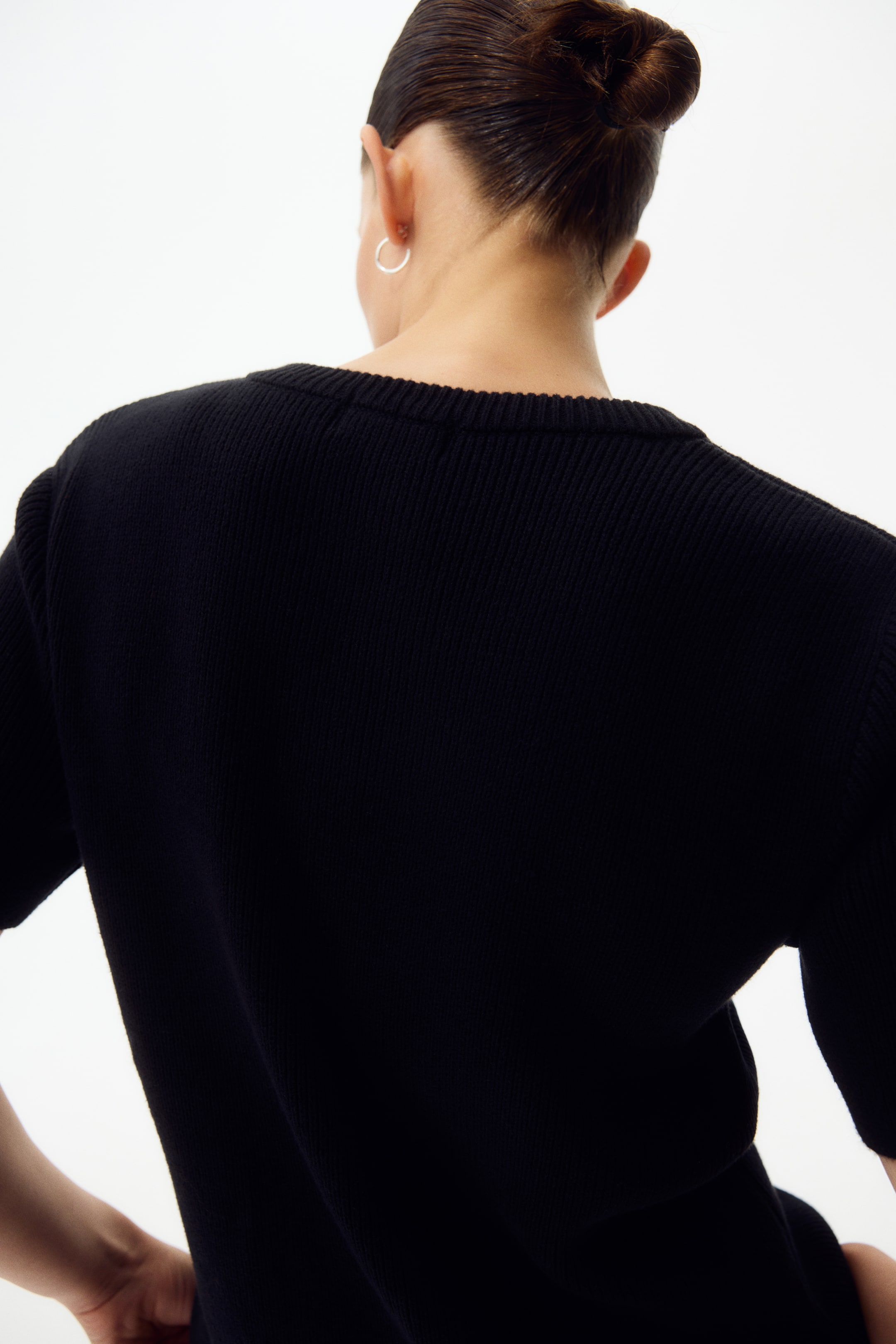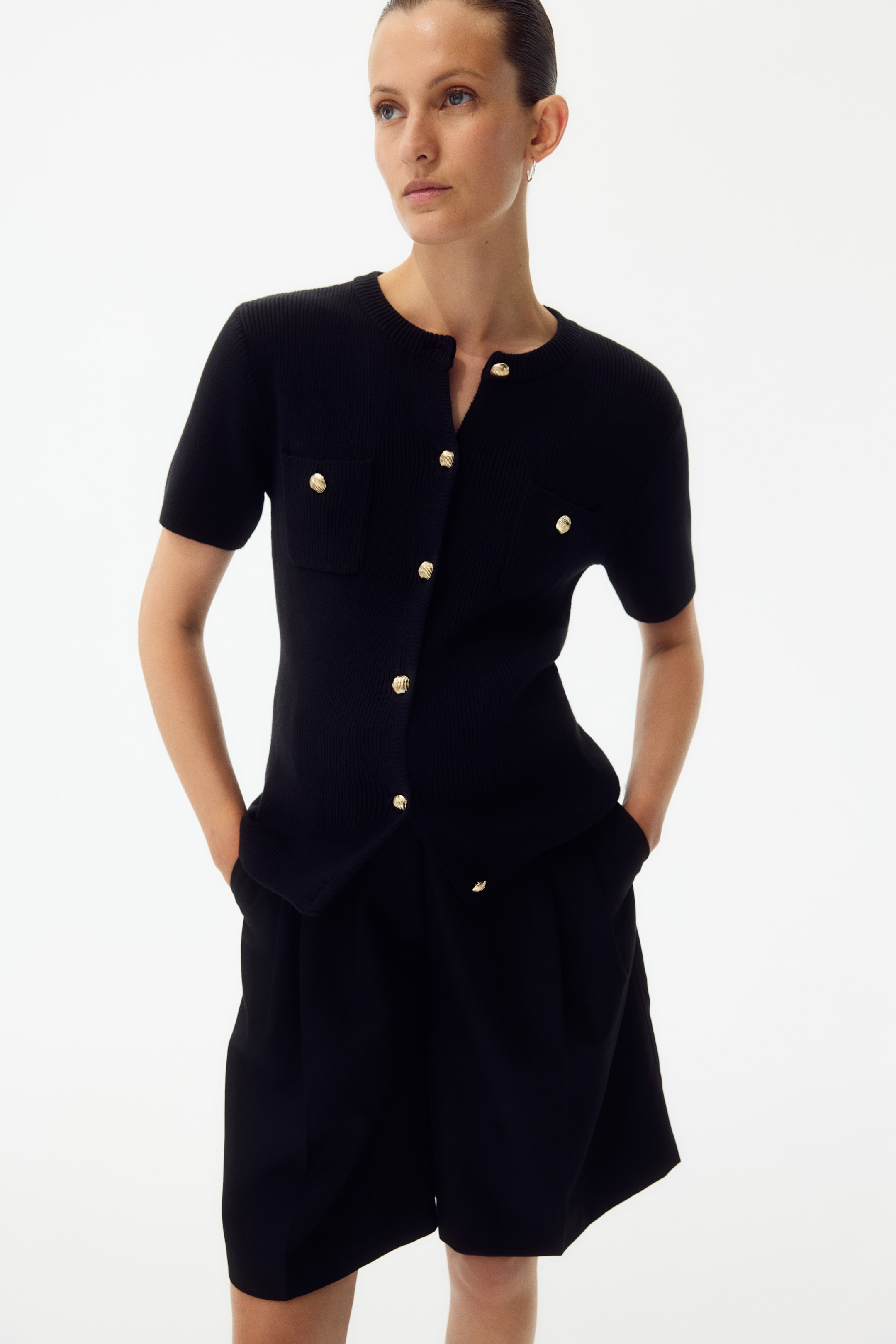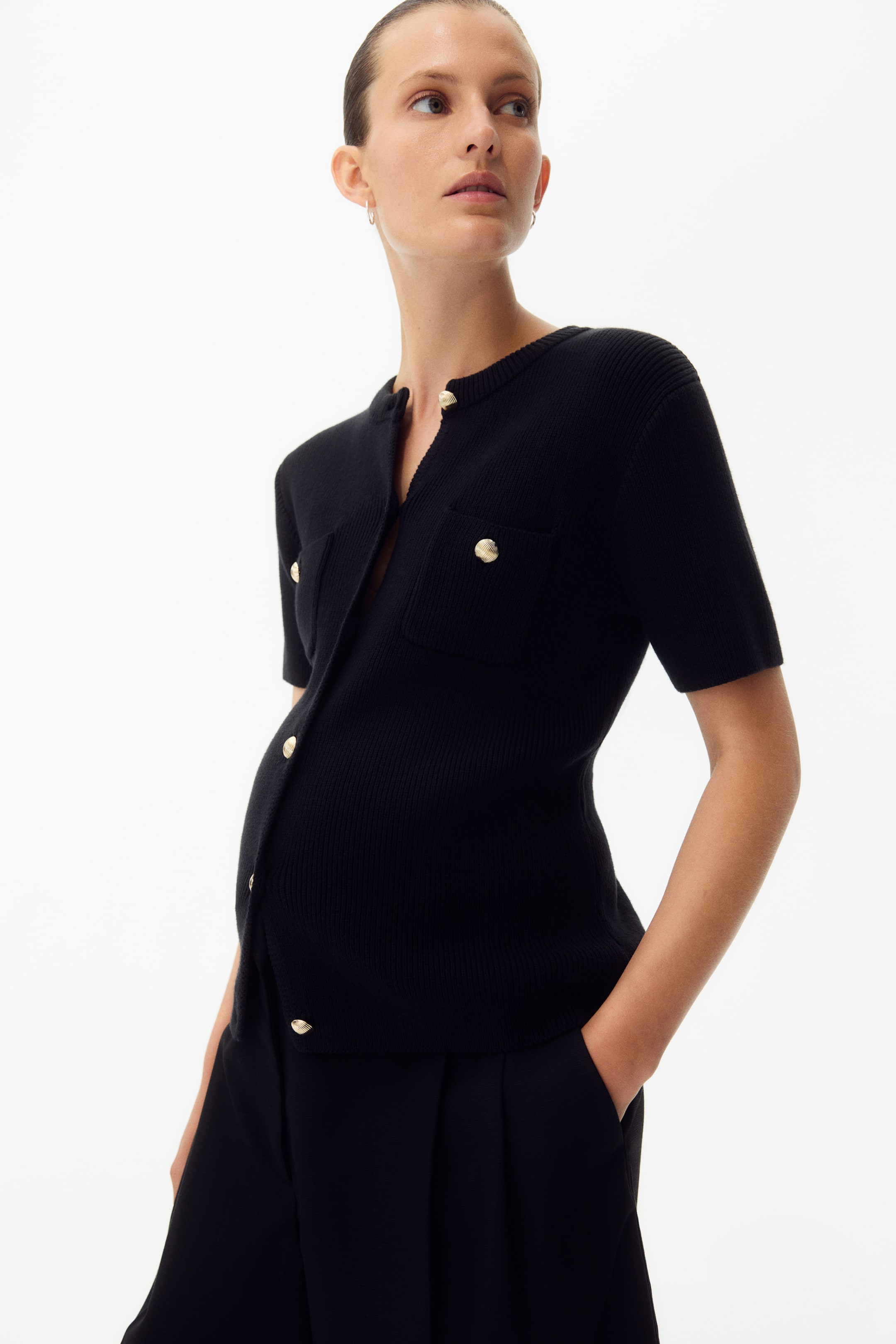 棉質羅紋針織開襟衫,短袖款式,圓領,正面金屬鈕扣開襟,有鈕扣式外縫胸袋。