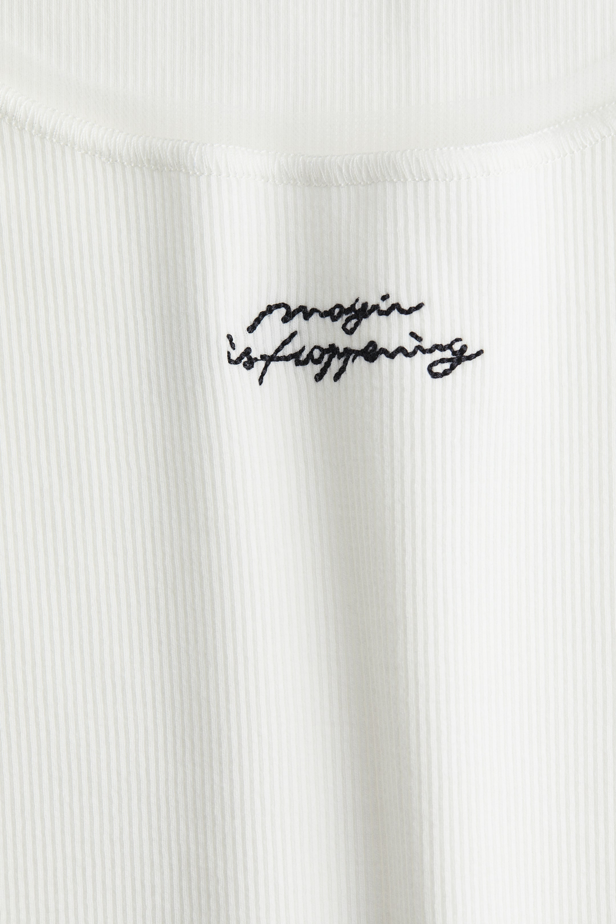 背心上衣,細羅紋平紋布料,合身剪裁,低圓領,寬肩帶。領口和袖口有精緻網紗飾邊,前胸中央有小刺繡字樣。