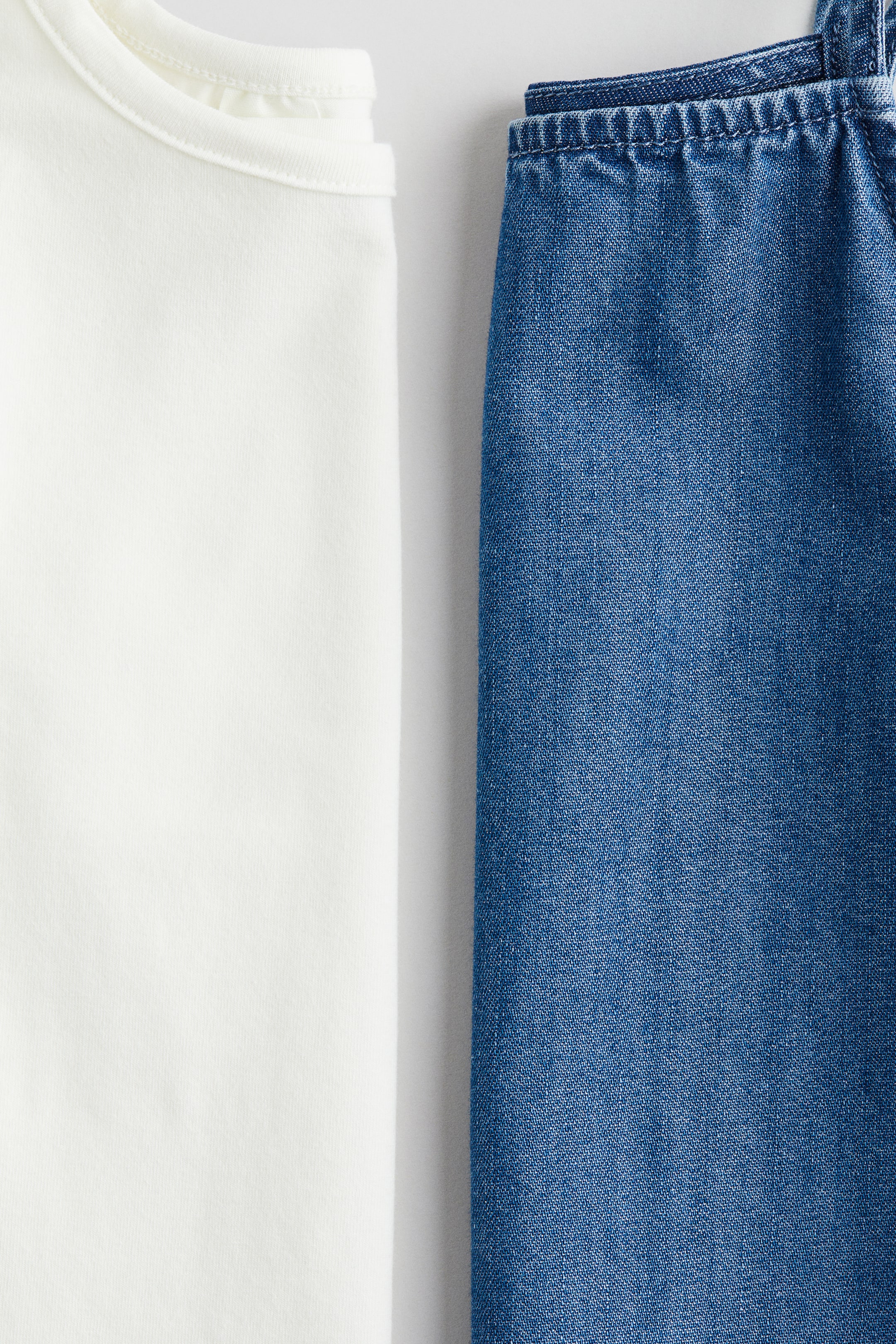 套裝,含丹寧細肩帶洋裝和柔軟棉質平紋上衣。方領洋裝,細肩帶上部有綁帶細節,裙襬有抓皺縫線,可增加豐盈感;短袖上衣,圓領有窄飾邊。